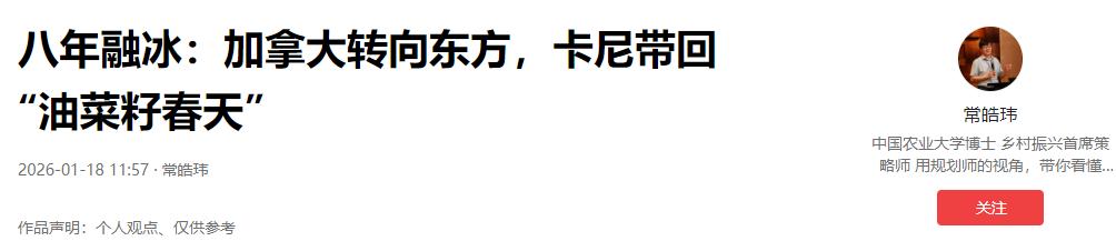 澳大利亚天塌了 在加拿大总理卡尼上周访华之后,一家中国进口商购买了一批加拿大油菜籽,多达6万吨,这极大提振了加拿大农民的前景。 但对于澳大利亚来说,这简直就是一个噩耗,因为加拿大抢走了本该属于他们的订单,这也让澳大利亚民众十分失望。 要知道这背后牵扯的是持续五年的贸易僵局、好不容易看到的破冰希望,以及被瞬间打乱的产业复苏计划。 澳大利亚作为全球第二大油菜籽出口国,曾是中国市场的重要供应商,2020年对华出口量一度接近44万吨,占当年中国菜籽总进口量的14.1%,彼时澳大利亚农民靠着中国订单,日子过得相当滋润。 可这一切从2021年初开始急转直下,中国为防控黑胫病传播,调整了油菜籽检疫标准,而澳大利亚供应商常因装运前清理不彻底,难以达标,其对华出口份额迅速萎缩至零,只能转头将菜籽销往欧洲、日本等国。 就在澳大利亚苦苦寻觅重返中国市场机会时,去年下半年出现了转机。由于中国对加拿大油菜籽发起反倾销调查,征收高额保证金,加拿大菜籽对华出口一度中断,2024年10月后月度进口量更是降至20年来罕见的零。 这个空档让澳大利亚看到了希望,2024年6月和7月,已有两批各500吨澳油菜籽小批量试运至中国,2025年7月,中澳更是接近达成协议,计划试运五船油菜籽,澳方甚至斥资升级清理设备,承诺将杂质控制在1%以下,澳大利亚农民满心期待着中国市场的大门彻底重启,挽回这五年的损失。 可卡尼的访华之行,直接击碎了澳大利亚的幻想。这次访华是加拿大总理八年来首次踏足中国,随行的200多人经济代表团里,不仅有萨斯喀彻温省省长——该省是加拿大最大油菜籽产区,还有农业、贸易领域的核心人士,目的很明确,就是要修复对华贸易关系,重中之重便是为油菜籽争取市场。 功夫不负有心人,双方达成了“电动车换油菜籽”的重磅协议:加拿大给予中国电动车每年4.9万辆的低关税配额,中国则承诺在2026年3月前,将加拿大油菜籽综合关税从84%降至15%左右,同时取消菜籽粕、龙虾等产品的歧视性关税。这6万吨订单,正是这份协议落地后的首个实质性成果,也是中加贸易回暖的明确信号。 对加拿大农民来说,这无疑是久旱逢甘霖。加拿大油菜籽有一半以上依赖对华出口,2024年对华出口额近50亿加元,贸易摩擦让他们仓库堆积如山,播种和育种计划都受了影响。 如今订单重启,关税下调几乎成定局,加拿大农业食品贸易联盟直言,这标志着双边贸易朝着稳定迈出了重要一步,农民终于能放下顾虑安排生产了。 中加还重启了农业联合委员会,签署了经贸合作路线图,除了油菜籽,宠物食品、豌豆等农产品的对华准入也被提上日程,后续合作空间巨大。 反观澳大利亚,处境就格外尴尬。本来靠着加拿大的贸易困境,澳大利亚好不容易夺回了部分市场机会,可中加关系一缓和,它就被打回了原点。 更要命的是,澳大利亚今年油菜籽产量预计仅570万吨,为五年最低,其中400万吨还要优先满足欧洲等传统客户,就算中国市场有需求,它也未必有足够产能承接。 况且澳大利亚的竞争劣势并未完全消除,相较于加拿大已适应中国检疫标准的成熟供应链,澳大利亚还需通过试运验证达标能力,如今加拿大抢占先机,澳大利亚想要再扩大对华出口,难度陡增。 其实这场“订单争夺战”的背后,本质是中国农产品进口多元化的必然选择。作为全球最大油菜籽进口国,中国绝不会把鸡蛋放在一个篮子里,之前依赖加拿大,后来尝试重启澳大利亚进口,都是为了保障供应链安全。 对中国而言,既需要稳定的供应来源,也需要通过多元合作争取更有利的贸易条件,中加、中澳的贸易调整,都是基于自身需求的务实选择,而非刻意针对某一方。 对澳大利亚来说,这次订单旁落也算是个警示。想要真正重返中国市场,仅靠等待竞争对手出问题远远不够,更需要补齐自身短板,严格满足检疫标准,优化供应链效率。 而中加贸易的回暖,也为全球农产品贸易提供了范本——通过平等对话化解摩擦,才能实现互利共赢。 未来,随着中加合作的全面展开,澳大利亚若不能加快调整步伐,恐怕还会错失更多中国市场的机会,这场“天塌了”的焦虑,或许还会持续一段时间。