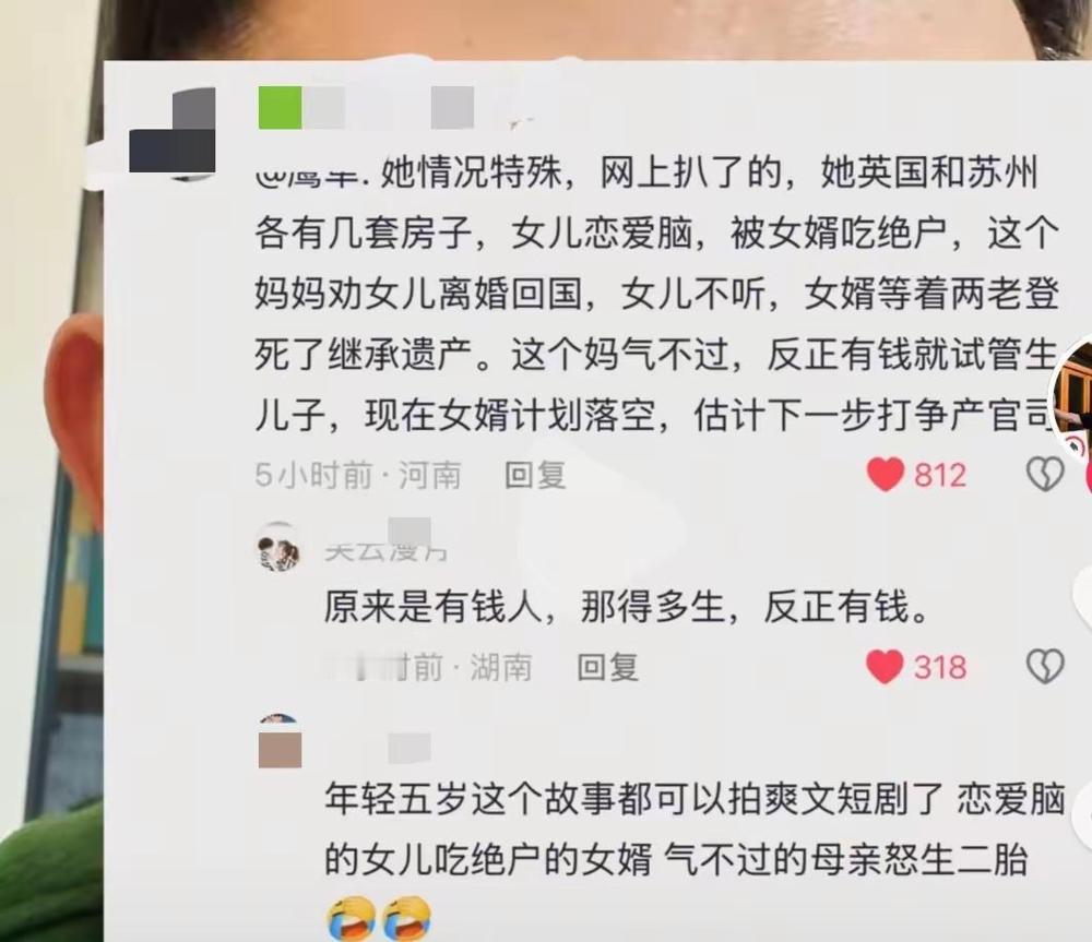 59岁坚持生二胎的宝妈,她家真的是有实力,在英国和苏州都有几套房子。 其实整件事看下来挺无奈的,这位大姐本来只有一个独生女儿,结果女婿不仅人强势,还把当初说好的孩子姓氏给改了,甚至带着全家搬到英国躲清静,摆明了就是在等老两口“百年之后”继承家产。 最戳我的一点是,亲闺女在这种时候完全立不起来,一颗心全扑在丈夫和孩子身上,压根不跟亲爹妈一条心。 我看大姐也是被逼到绝路了,与其眼睁睁看着苏州和英国的房产最后落入这种“白眼狼”手里,不如豁出命去拼个转机。 所以她果断调理身体,在59岁高龄生下了这个小儿子。 我觉得这已经不是单纯的追生了,这简直是一场高难度的“资产保卫战”,用这种方式强行改写了家产的继承走向。 现在局面彻底反转,原本以为稳拿的“煮熟的鸭子”飞了,估计那位远在英国的女婿,现在真是后悔得拍断了大腿。 虽然59岁生娃确实风险极大,但换个角度看,这大概是这位母亲对女儿女婿这种冷漠态度最硬气的回击了。