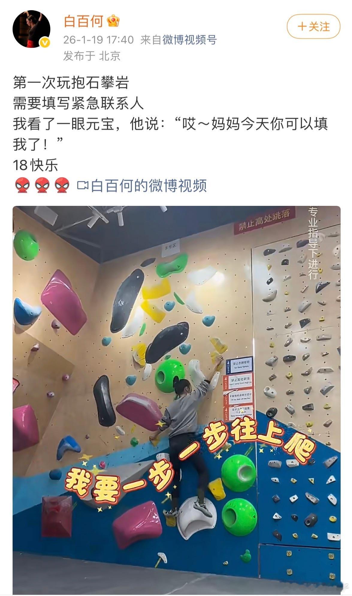 白百何儿子元宝18岁了❗️白百何第一次玩抱石攀岩要填紧急联系人时,元宝主动说妈妈可以填他,18岁的小男孩已经想当妈妈的依靠了,感觉长得像爸爸多一点!