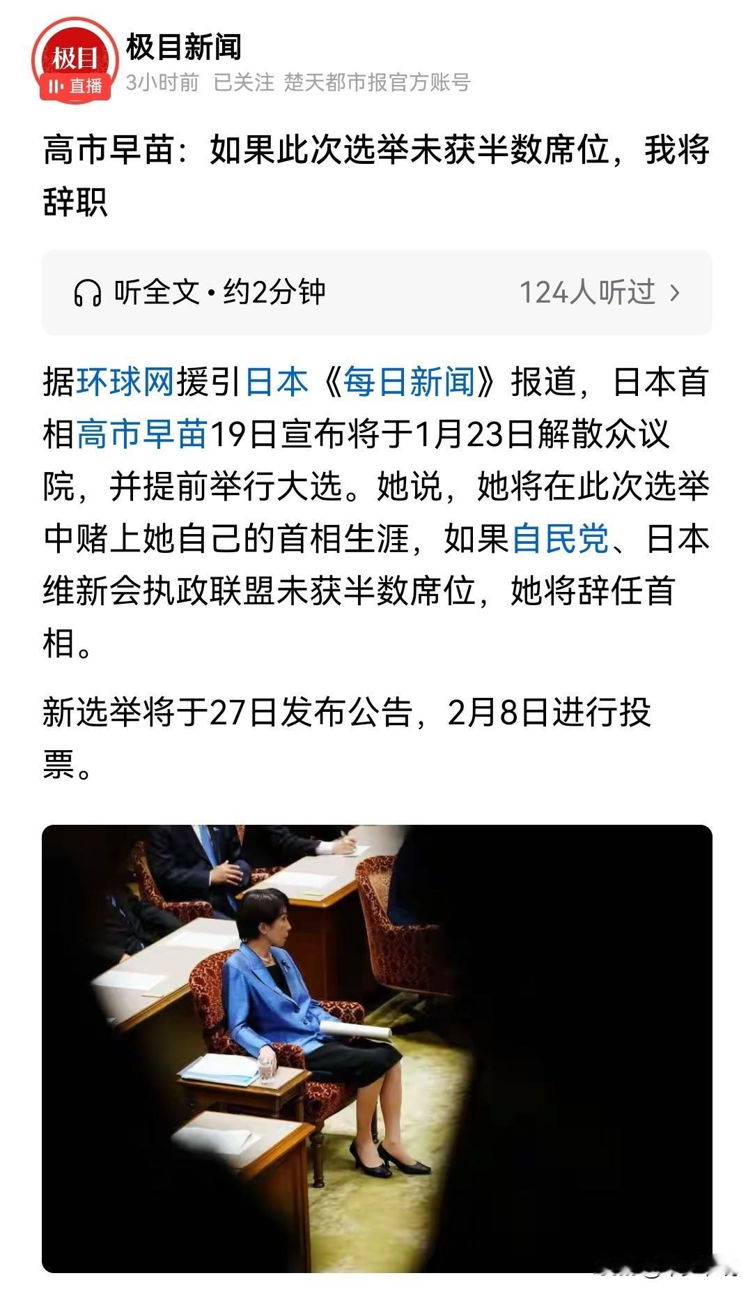 高市早苗挑衅完“就想跑” 高市早苗称“如果此次选举未获半数席位,我将辞职”,这是已经做好了“跑路”的准备。 高市早苗上任以来没给日本干一件好事,上任之后挑衅中国,被中国制裁后日本的经济一塌糊涂,通货膨胀达到近20年来最高,现在眼见没有办法恢复经济以及与中国的关系就想通过选举来“跑路”,让新一届政府来修复与中国的关系。