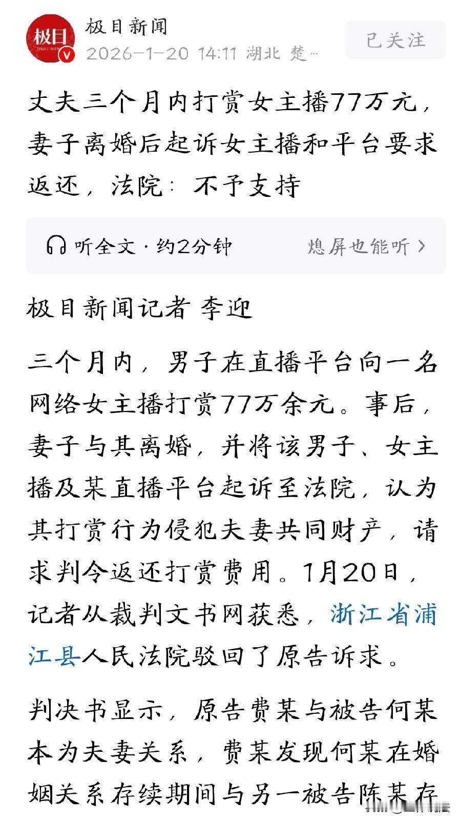 浙江金华,丈夫沉迷网络直播,和女主播暧昧不清不说,在对方诱导下,他还多次给对方打赏,且数额巨大,短短3个多月,就砸进去77万。妻子发现后忍无可忍,果断跟丈夫离婚。事后,她思来想去咽不下这口气,又将丈夫、女主播和平台告上法庭,要求返还打赏的这笔钱。谁知,法院的判决让人大跌眼镜。 费某和丈夫何某结婚之后,日子过得吃喝不愁,平静安稳。 可日子过得舒坦了,何某反倒开始不稳当,他天天抱着手机光顾各大直播间,最后甚至跟一名年轻的女主播陈某搞起了暧昧。 费某得知后心里很不是滋味,丈夫从没有给自己说过这些甜言蜜语,但更让她气愤的是,在陈某的哄骗和诱导下,丈夫何某竟通过平台,不断给陈某打赏,且数额巨大。 经过统计,从2024年3月到2024年6月13日,短短三个月的时间,何某就打赏出去77万余元。 费某心里在滴血,这钱可是他们夫妻俩一起挣的血汗钱,是夫妻共同财产,何某怎么能这么肆无忌惮地挥霍呢? 费某又气又急,多次跟丈夫理论,可何某根本不把她的话当回事,毫不收敛。 丈夫的冷漠让费某对这段感情彻底死心,最后实在忍无可忍,选择离婚。 离婚后的费某,思来想去,心里还是咽不下这口气。 她觉得何某对陈某的打赏行为,不仅违背了公序良俗,更是严重侵犯了她作为夫妻另一方的财产权利。 男人可以不要,但自己的血汗钱不能白白便宜了那个女人,一定要讨个说法。 于是,费某一咬牙,把何某、陈某还有直播平台一起告上法庭,要求返还77万余元的打赏费用。 这笔钱究竟能否要回呢?本案的争议焦点在于,何某对女主播陈某充值打赏行为的性质。 《民法典》第1062条规定:夫妻在婚姻关系存续期间所得的下列财产,为夫妻的共同财产,归夫妻共同所有:(一)工资、奖金、劳务报酬;(二)生产、经营、投资的收益……夫妻对共同财产,有平等的处理权。 法院审理认为,何某打赏的77万元属于夫妻共同财产,夫妻对共同财产享有平等处理权。 但处理权并非一方可任意处分,而是分为日常家事代理权与非日常家事处分权,何某通过平台充值并给直播的陈某打赏,这属于网络消费行为。 何某在直播平台注册用户、观看网络直播,都是出于文化娱乐的目的,他在平台充值、打赏后,也获得了相应的个性化网络服务。 费某虽然提供了相应证据,但这些证据并不足以证明何某的充值打赏行为和他与陈某的不正当关系有关。 何某则辩称是陈某诱导他充值打赏,可在法院指定的期间内,他根本拿不出任何证据来支持自己的说法,法院自然就不采信他的辩解了。 另外,直播平台在用户注册、充值、打赏的时候,都设置了相应的提醒,已经尽到了提示义务。 综合以上情况,法院觉得费某现有的证据没办法证明何某违背了夫妻忠实义务,也没办法证明何某是以打赏的方式不当处分了夫妻共同财产。 何某作为完全民事行为能力人,他在抖音平台的充值打赏行为是自主的,并没有违反法律的禁止性规定,而且案涉款项并不产生赠与的合同效力。 最终,法院判决:不支持费某要求陈某及直播平台返还案涉款项的诉讼请求。 听到这个判决结果,费某彻底懵了。