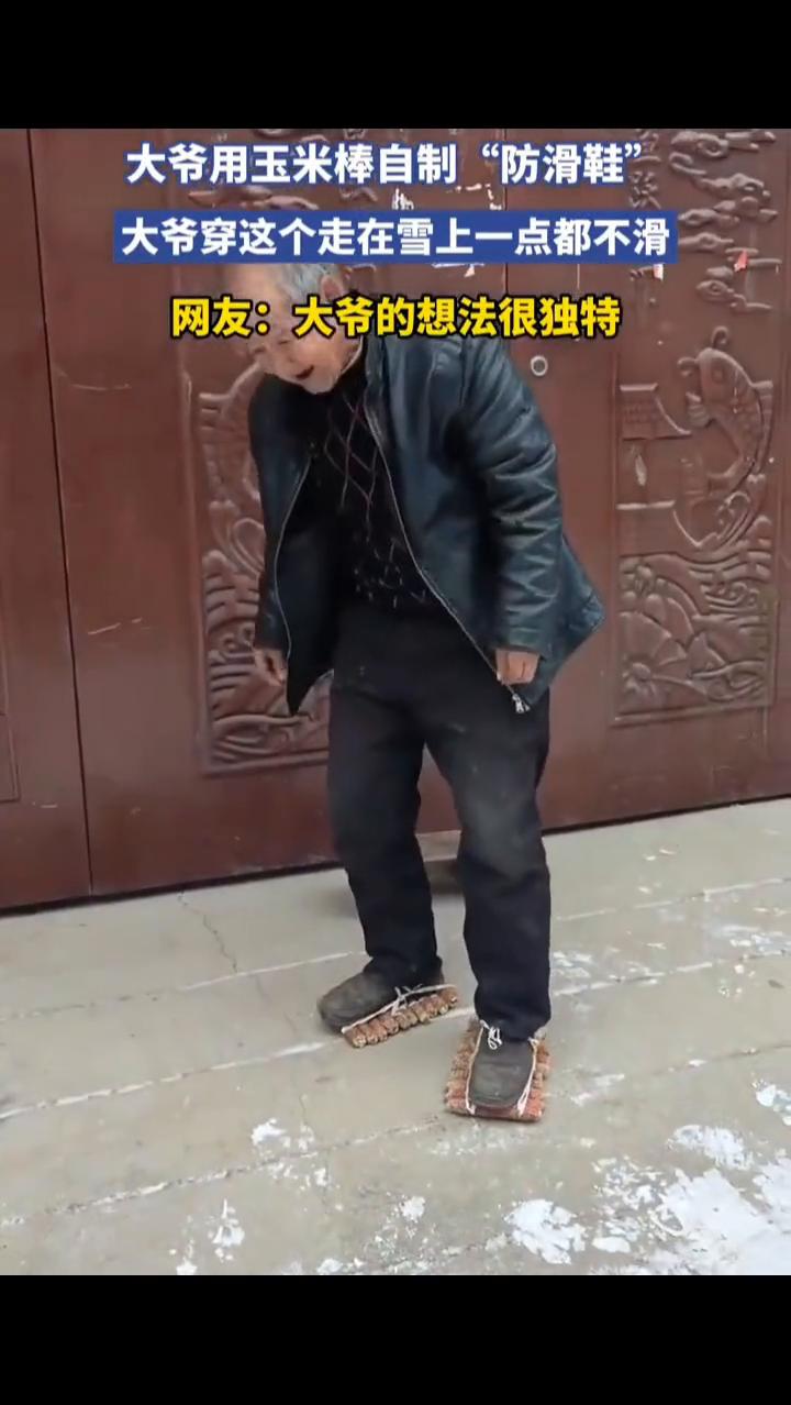 大爷用玉米棒自制"防滑鞋",大爷穿这个走在雪上一点都不滑。 网友:大爷的想法很独