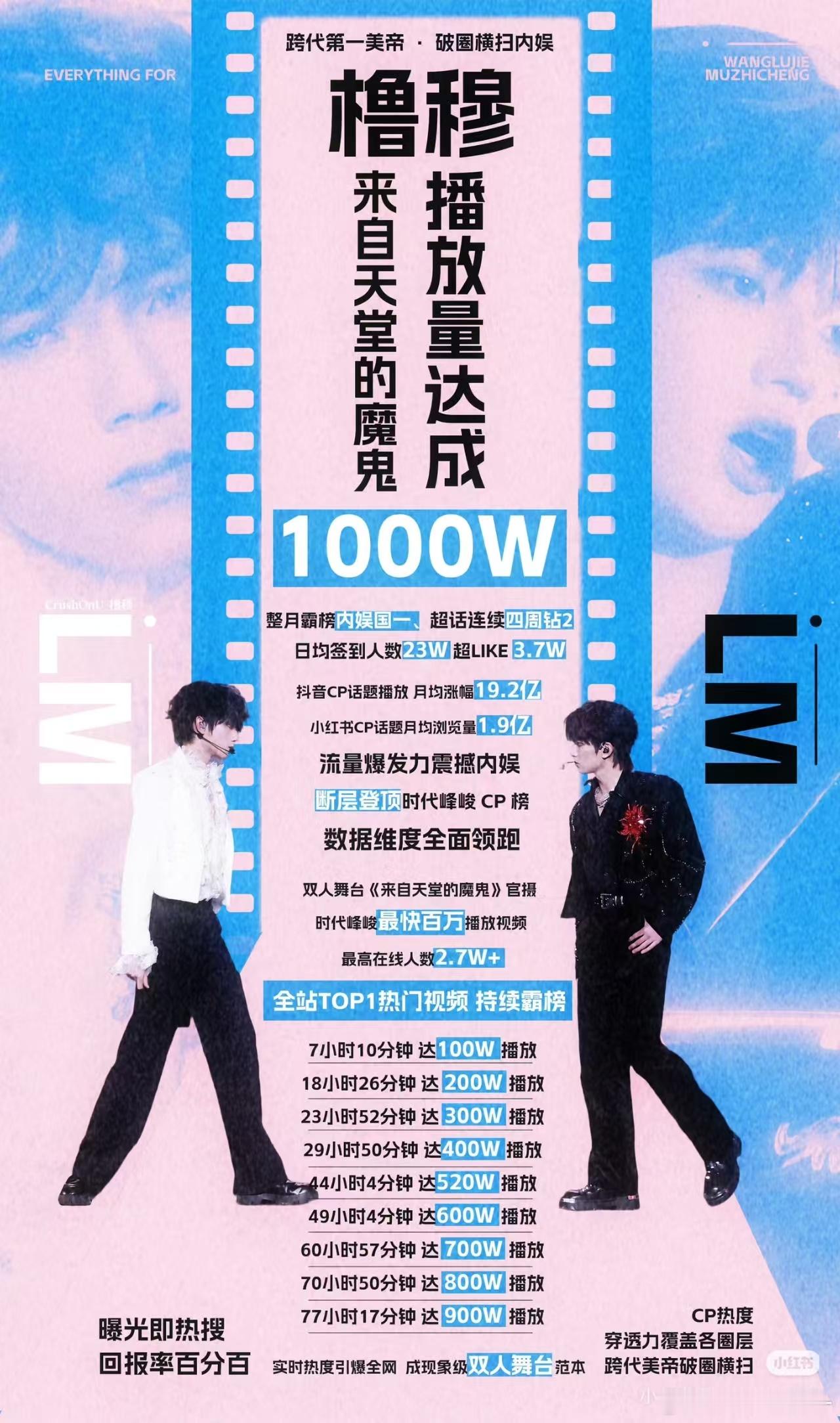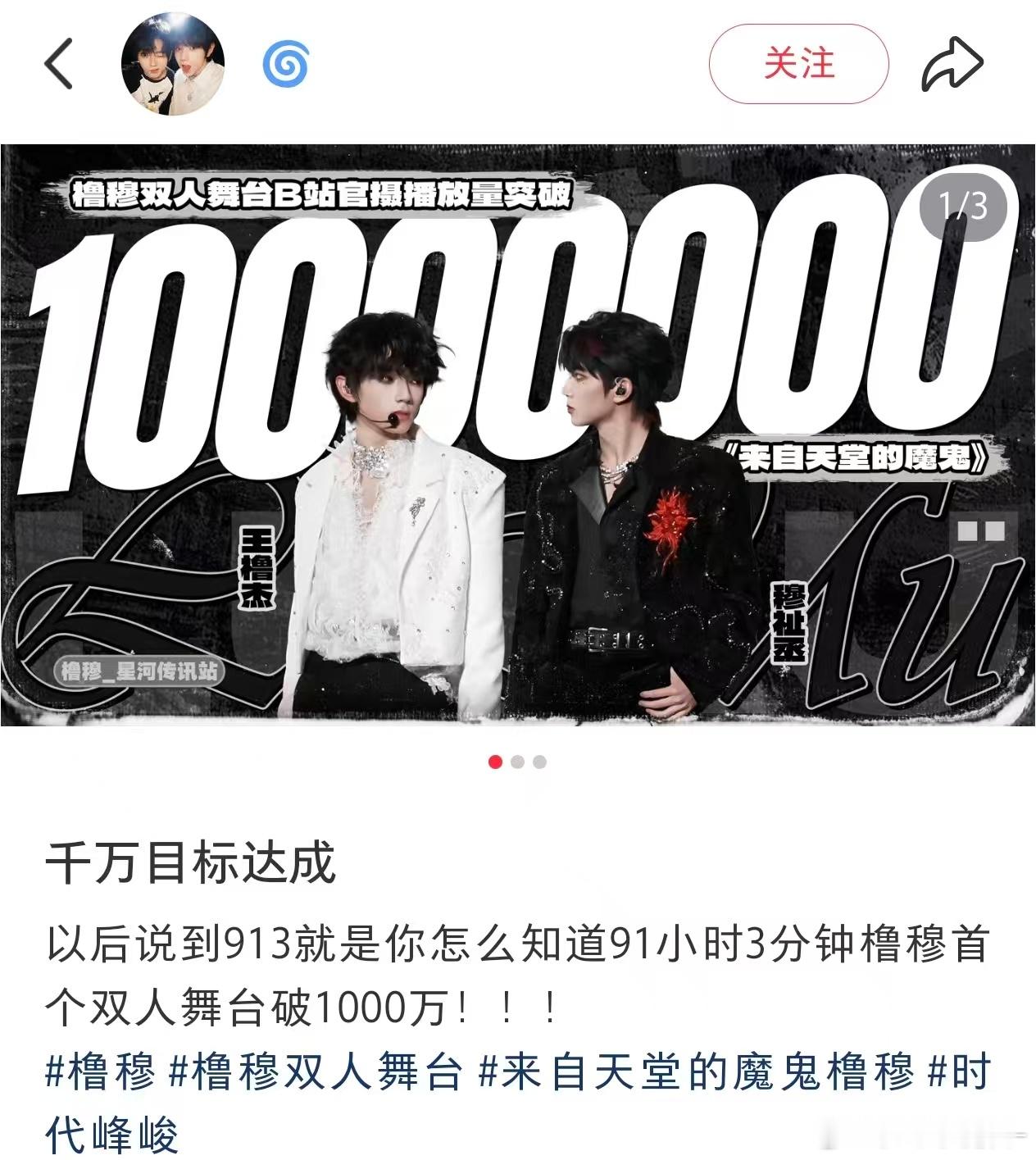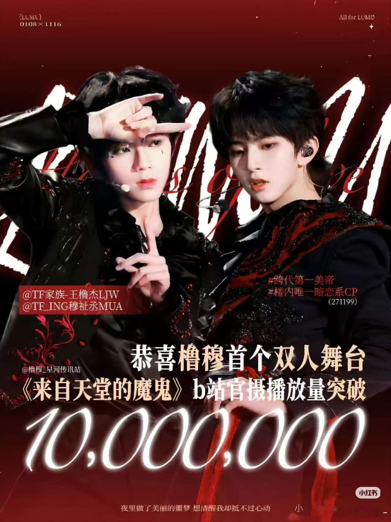 橹穆双人舞台官摄破一千万 恭喜王橹杰 穆祉丞双人舞台《来自天堂的魔鬼》,仅仅只用了91h 3分钟 b站官摄播放量就突破1000w,白衣天使vs黑衣魔鬼,破1000w从来不是重点,舞台上的热血会一直传递下去,期待跨代唯一美帝 橹穆 越来越好!