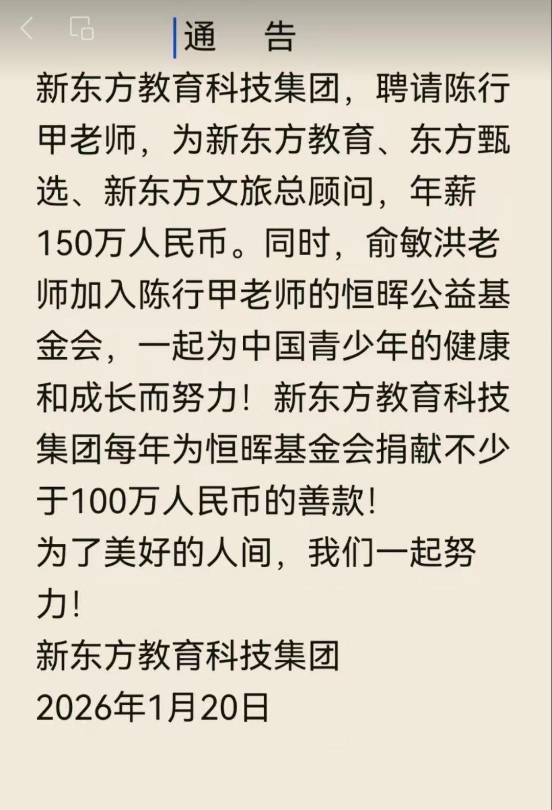 2026年初,一条消息令人注目:俞敏洪以百万年薪,请动了曾经的“网红书记”陈行甲。 人们不禁好奇,这位1971年生于湖北山村的男人,究竟有何魅力? 他的人生,像一条清澈而执着的河流。1992年,数学系毕业的他因家乡需要,毅然回到山区。从燃化局技术员到镇党委书记,他的根越扎越深。 2001年,已是一镇之长的他考入清华,攻读公共管理。人们以为这位才子将走向更大的舞台,他却再次回到湖北基层。2011年,他主动请缨前往深度贫困的巴东县,像一位沉静的医者,细心诊治着这片土地的沉疴。 2015年,他被评为“全国优秀县委书记”,荣誉加身。然而次年,任职期满的他做出了最令人意外的选择——辞去公职,转身创立儿童公益基金会,成为帮助大病患儿的“陈叔叔”。 十年官场,十年公益。如今俞敏洪的邀约,或许看中的正是他这份始终如一的特质:无论身处庙堂还是江湖,他始终是那个从山村走出,眼中看得见疾苦,心中装得下苍生的赤子。这份纯粹,在任何一个时代,都是最珍贵的品质。