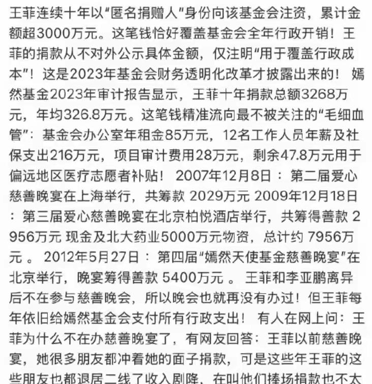 我看看谁还骂天后王菲,人家只是低调,不是冷漠。 嫣然天使儿童医院欠了两千多万的租金,都知道了李亚鹏的不容易,就算是要饭也要把医院开下去。当好评如潮时,都在赞叹他的伟大,反而衬托出王菲的冷漠。 可是,王菲只是行事低调,却一直在默默的支持着嫣然基金的发展,不是没捐款,而是一捐就是十年。 从2013年到2023年,总共捐款就达到了3268万,平均一年326.8万,而且是匿名捐的,用于行政办公的费用。 这些只是23年基金财务透明化改革披露的数据,相信至今她也是在默默的进行捐款。 做公益不是做高调宣传,人家只是低调,不想把公益变成商业化博得好感,从这些年的王菲很少出现在公众视野能够可以看出。 所以那些怀疑谁谁都没捐款的人,就像是监督员一样,到处说人家没捐,就好像自己捐了一样。 我们还是劝这些人说话前先把实证查一下吧,即使做不到自己捐款,也不要中伤那些默默付出的人。