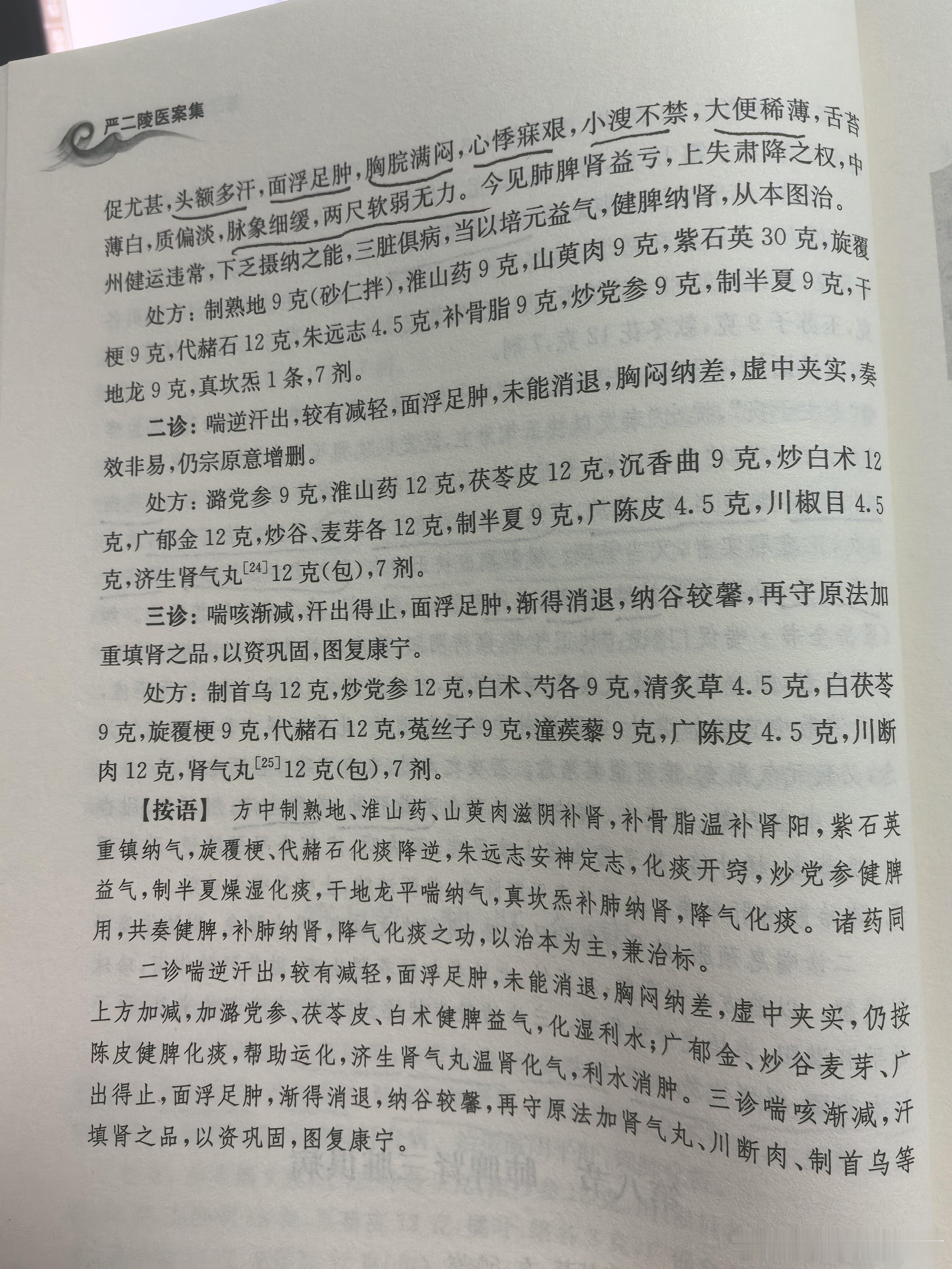 肺脾肾三脏皆虚,动则喘促,面肿足肿,心慌寐差,胸闷脘满,大小便不禁,怎么办?严老一诊从肾入手,稍佐运脾,患者不能耐受,吃不下饭,胸闷浮肿。这不是治错了,而是脾胃不和,补肾药吸收不了。二诊汤药以运脾为主,补肾的中成药济生肾气丸和汤药一起煎,脾胃容易接受,疗效很好。三诊增加温润填肾之品以巩固,地黄等滋腻药仍以中成药的方式同煎。中成药纳入汤药同煎,几乎是严老每案必用之法,前贤之巧思,值得学习