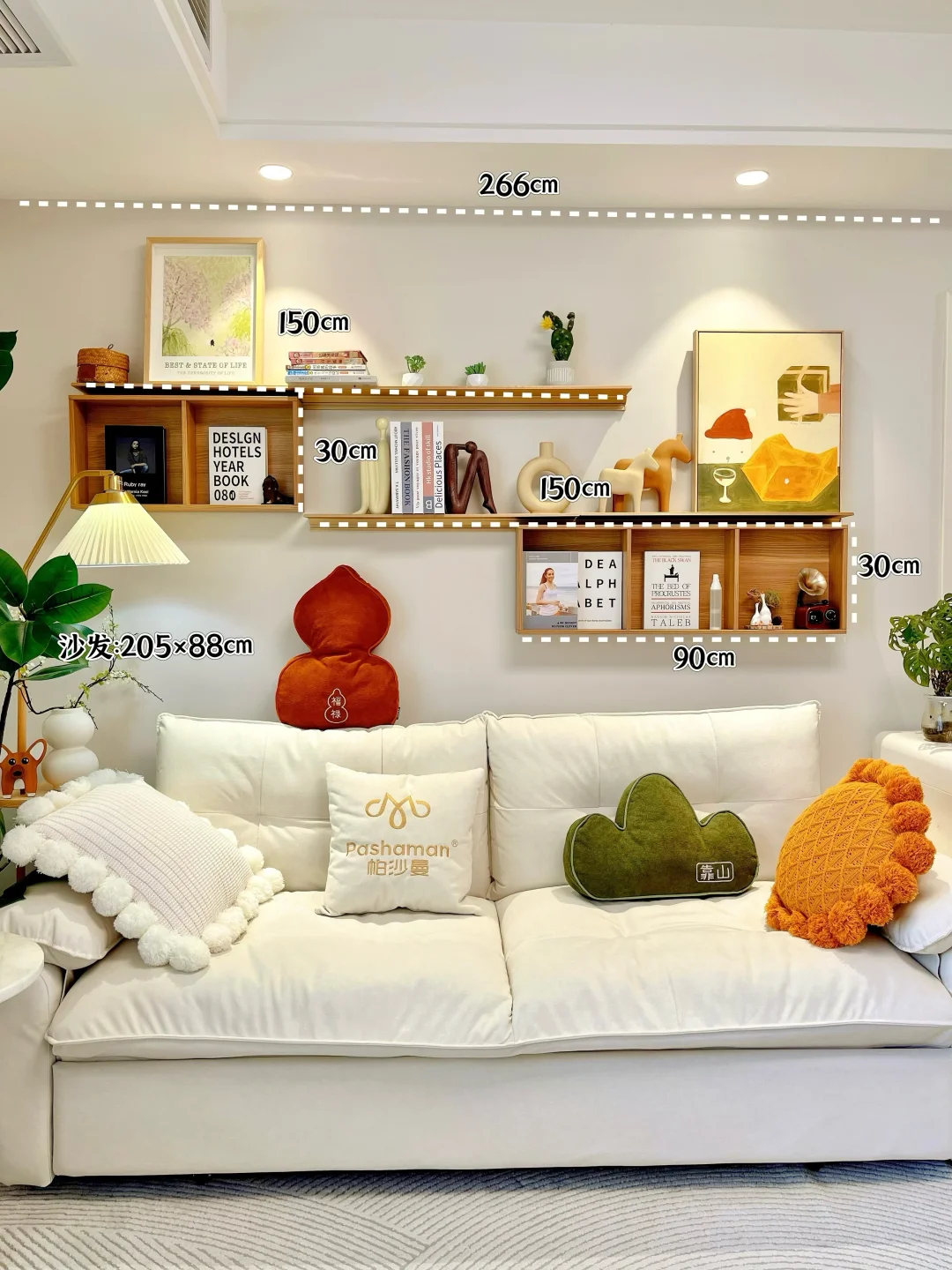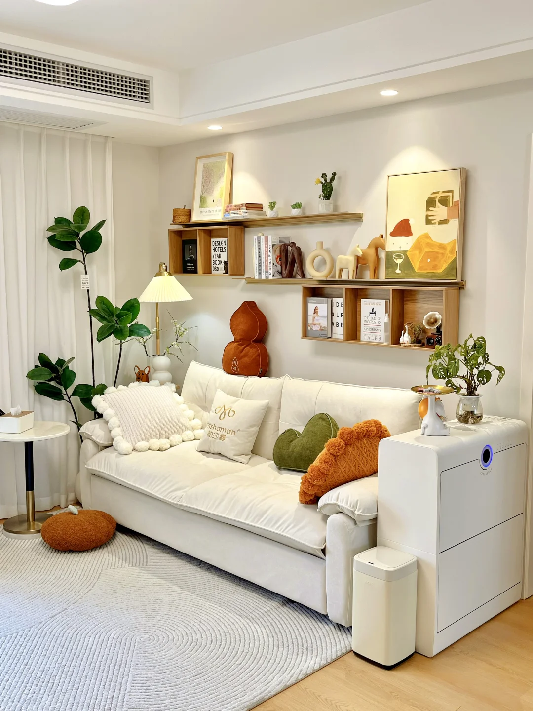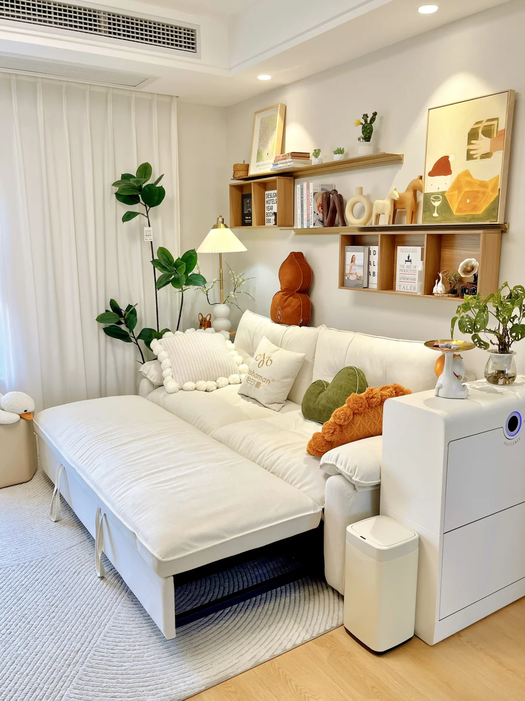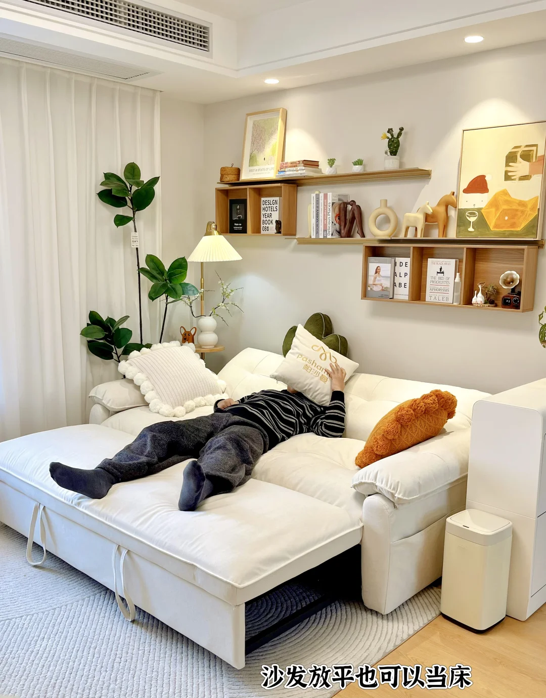 坐标📍:南京郊区 产证76平,套内60平,三年前自己自装的,硬装花费7.2万已经入住3年了,这些年也不断的重新布置软装,也获得不少的粉丝喜欢~ 其实我最省钱的部分还是橱柜因为是木工打的所有比较省钱全屋只花了1.7万~ 关于我家客厅好多粉丝问的最多的就是沙发,和沙发后面的挂挂墙,我今天就来给大家解答一下: 我选的沙发是帕沙曼家沄巢沙发,它既可以当床也可以当沙发特别适合小户型客厅 它的变身技能很戳我,轻轻拉开坐垫,62cm座深的直排沙发秒成了130cm的沙发床,中午懒得回卧室,窝在上面眯一觉刚刚好,再把头顶的头靠放下来,解锁 2m的大床,周末和娃一起躺在上面看动画、翻绘本,宽敞又惬意~ 五档可调的靠背,简直是为我们一家三口量身定做的,我蜷在上面追剧,老公靠着看球赛,娃趴着搭积木,每个人都能找到自己舒服的姿势,羽绒+绒丝棉的座包,软乎乎的却不塌陷,腰背被稳稳托住,我可以躺着一下午不挪窝~ 好多姐妹都担心白色沙发不耐脏,我当初也纠结了好久。但这款奶呼呼的米白色猫抓布绒面料,真的太懂带娃家庭了!手感细腻软fufu的,还特别耐磨。娃在上面蹭的零食渣,牛奶渍都不用慌,直接丢进洗衣机洗就好了,晒干后又白白净净的 小家呢不大,也足够我们一家三口住了,虽然入住三年了但还是喜欢,你们觉得我家过时了吗?