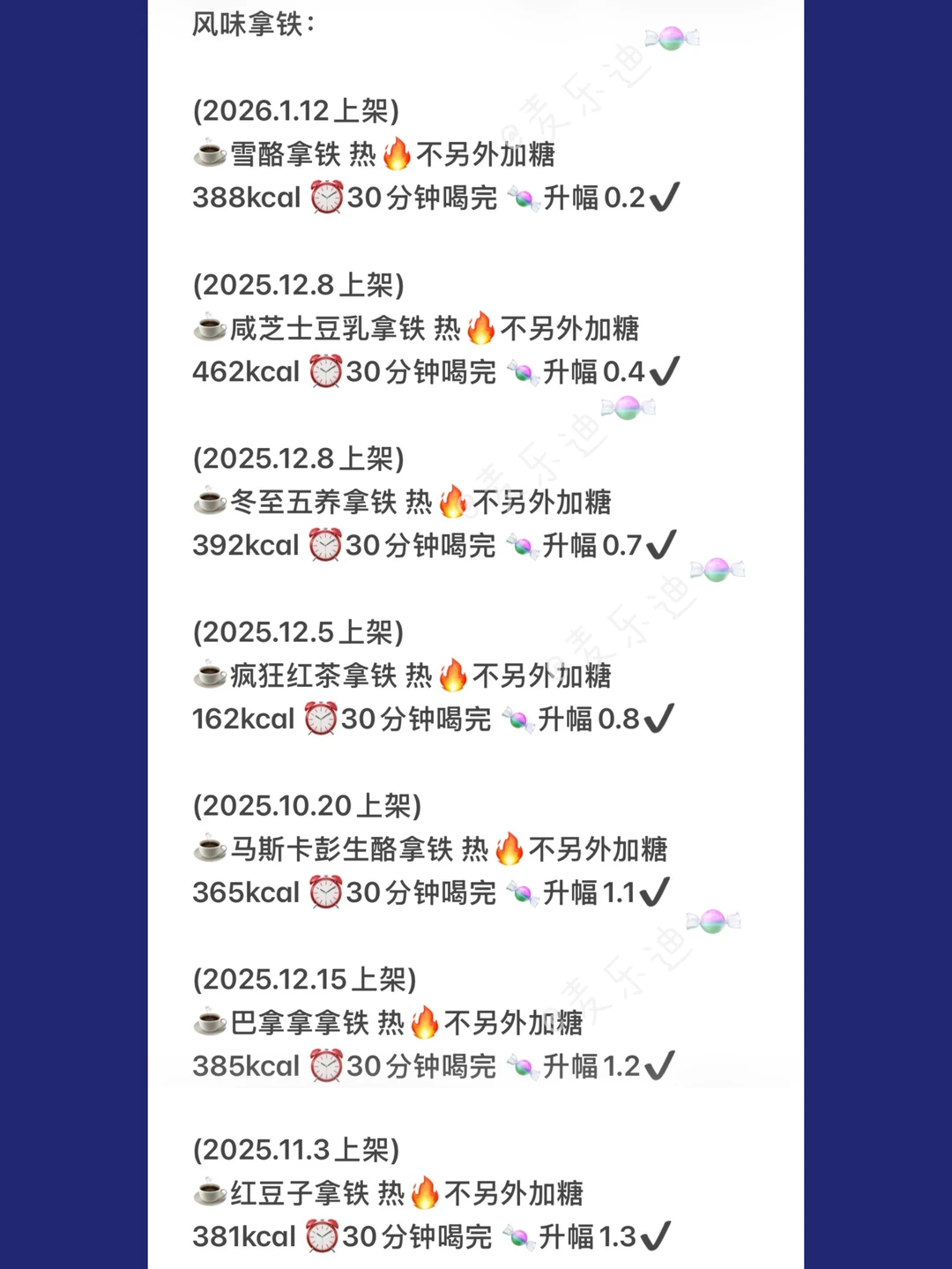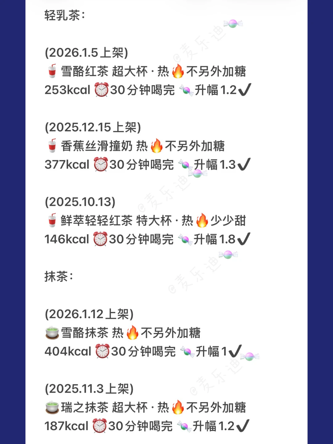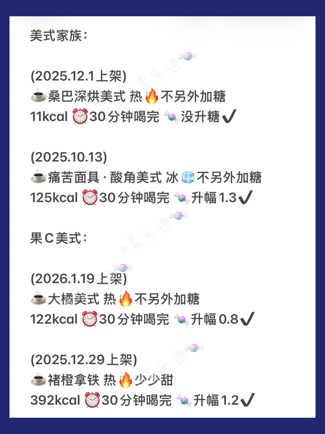 总结了一下瑞幸2025秋冬-2026初的19杯低糖在售新品饮品。上架时间都有标注,如果没有发就是没测,或是升糖略高,或是已经下架的❗回归品也是重测过的最新数据🆕其他常驻品没有收录🫶🏻 千人千糖 理性参考👀 升糖小参照: 本人吃100克馒头升幅3.8↑ 本人喝瑞幸老版橙C美式🧊不另外加糖 5分钟喝完升幅3.4↑ 30分钟喝完升幅2.7↑ 1小时喝完升幅1.7✔ 饮用速度越慢 升糖越低(仅针对本人) 千人千糖,测糖无标准答案,宝子们简单做下参照即可🫶🏻 图三: 美式家族: 桑巴深烘美式 痛苦面具·酸角美式 果C美式: 大橘美式 褚橙美式 图四: 风味拿铁: 雪酪拿铁 咸芝士豆乳拿铁 冬至五养拿铁 疯狂红茶拿铁 马斯卡彭生酪拿铁 巴拿拿拿铁 红豆子拿铁 图五: 轻乳茶: 雪酪红茶 香蕉丝滑撞奶 鲜萃轻轻红茶 抹茶: 雪酪抹茶 瑞之抹茶 图六: 大师咖啡: 桑巴深烘拿铁 黑糖玛奇朵 不喝咖啡: 芒果奶冻 热量参考来自[吧唧R][吧唧R] [打卡R]减脂的宝子建议选择升幅2.2以内的饮品 [打卡R]生酮的宝子建议选择升幅1.2以内的饮品 慢慢喝也可以让血糖平稳一些,但千人千糖,请根据自己的情况来选择哦[okR] 🥂情况介绍:有家族🍬史 目前不是🍬人🥂