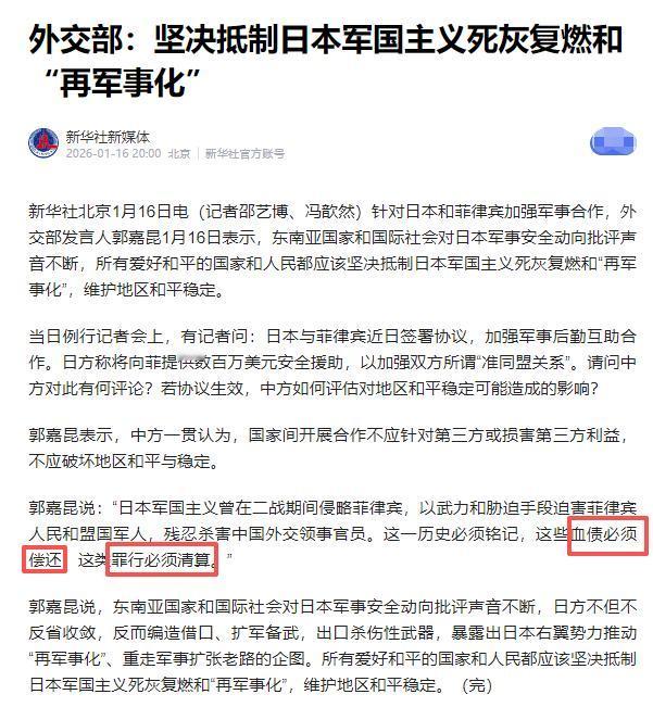 外交部发言人郭嘉昆在记者会上,罕见的用“血债必须偿还”和“罪行必须清算”的措辞警告日本。 在我印象中,这是我国第一次用这样严厉而直白的措辞发声,从中能看出什么弦外之音? 这份表态绝非一时情绪的宣泄。中方外交发言向来注重措辞分寸,哪怕面对各类国际争议,过往也多以“敦促正视”“坚决反对”等表述传递立场。此次直接点出“血债”“清算”,彻底打破了长期以来的外交表达惯例。 背后核心触发点,是近期日菲持续强化军事勾连的危险动向。双方刚签署军事后勤互助协议,日方还明确表态将向菲律宾提供数百万美元安全援助,刻意打造所谓“准同盟关系”。这种军事捆绑动作,正是郭嘉昆作出严厉回应的直接缘由。 日菲这场军事合作,本质藏着日方的深层野心。日本近年不断背弃战后“专守防卫”原则,持续大幅增加防卫开支,频繁突破武器出口限制,一步步推动自身“再军事化”。拉拢菲律宾强化军事联动,就是日方借地区议题扩张影响力、试探军事扩张底线的重要手段。 国际社会都清楚,日本从未对二战时期的侵略罪行完成彻底清算。二战期间,日本军国主义铁蹄踏遍东南亚,不仅在中国犯下罄竹难书的罪行,更曾侵略菲律宾,以武力胁迫手段迫害当地民众与盟国军人,还残忍杀害中国外交领事官员。这些史实有铁证支撑,绝非日方想抹就能抹去的。 中方此前的克制,并非遗忘历史,而是出于维护地区和平稳定的考量。从以往敦促日方正视侵略历史,到警告其军事动向危害地区安全,中方表态强度始终随日方动作逐步升级。此次措辞的质变,就是对日本借军事合作重拾扩张野心的集中反击。 日菲强化军事勾连,本身就带着对抗第三方的意味。日方一边回避历史罪行,一边加紧和区域国家绑定军事关系,还借机扩军备武、出口杀伤性武器,其右翼势力推动“再军事化”、重走军事扩张老路的企图昭然若揭。这种行径既破坏地区和平稳定,更冲撞了二战后形成的国际秩序底线。 “血债必须偿还”六个字,承载着受害国人民的集体伤痛记忆。当年日本军国主义带来的创伤,在中、菲等国人民心中至今未愈。这些血债不是时间能淡化的,更不是日方一句否认就能掩盖的,历史的账终究要算清楚。 “罪行必须清算”则传递出明确的底线信号。东京审判早已用国际法名义给日本军国主义的侵略罪行定了性,联合国多项文件也肯定了这一审判的正义性。日方若持续回避清算罪行,甚至借军事合作美化侵略历史,只会让周边国家更加警惕,最终自食恶果。 郭嘉昆的这番表态,有着坚实的法理与舆论支撑。1943年的《开罗宣言》、1945年的《波茨坦公告》,早已为战后秩序划定红线,明确禁止日本重走军事扩张道路。如今日方的一系列动作,正是在触碰这些历史与法理红线。 中方的警告绝非空话,已构建起体系化的反制与震慑措施。法律层面,《不可靠实体清单规定》可将参与危害地区安全合作的企业纳入制裁范围。经济层面,对日相关敏感技术与产品的进口审查已形成有效约束。外交层面,中方持续向国际社会揭露日方历史修正主义与军事扩张野心。 国际社会对日本的军事动向也不乏批评声音。东南亚多国早已对日本“再军事化”保持高度警惕,不少国家公开表态反对任何破坏地区平衡的军事合作。中方的发声,也凝聚了这些爱好和平国家的共同立场。 日方需要清醒认识到,地区和平稳定不是其扩张野心的垫脚石。中方维护国家主权、安全和发展利益的决心坚定不移,对待历史问题的耐心更是有限度的,克制绝不等于无底线。 那些试图否认战争罪行、重拾军国主义野心的势力,终究会被历史唾弃。日本若继续拉拢区域国家搞军事对抗,在历史问题上避重就轻,只会进一步孤立自己,最终引火烧身。 此次郭嘉昆的直白严厉表态,既是对历史受害者的告慰,也是对日本危险动向的当头棒喝,更是对地区和平稳定的坚定守护。 历史不会重演,但必须被敬畏。日本唯有彻底清算罪行、正视历史真相,停止一切军事扩张小动作,才能真正融入地区和平发展大局。任何试图篡改历史、挑衅红线的行为,都必将遭到坚决反制。 世界各国都应警惕日本军国主义死灰复燃。唯有守住历史底线,共同抵制各类破坏地区稳定的军事勾连,才能守护好当前的和平局面,这是不容置疑的真理。 后续日方是否会收敛军事扩张动作,日菲军事合作能否持续推进,值得持续关注。但可以肯定的是,中方会始终站在历史正义一边,对任何损害地区和平与中方利益的行为保持零容忍。 血债必须偿还,这是历史的审判。罪行必须清算,这是时代的要求。任何妄图挑战历史定论、触碰中方红线的势力,都注定无法得逞。