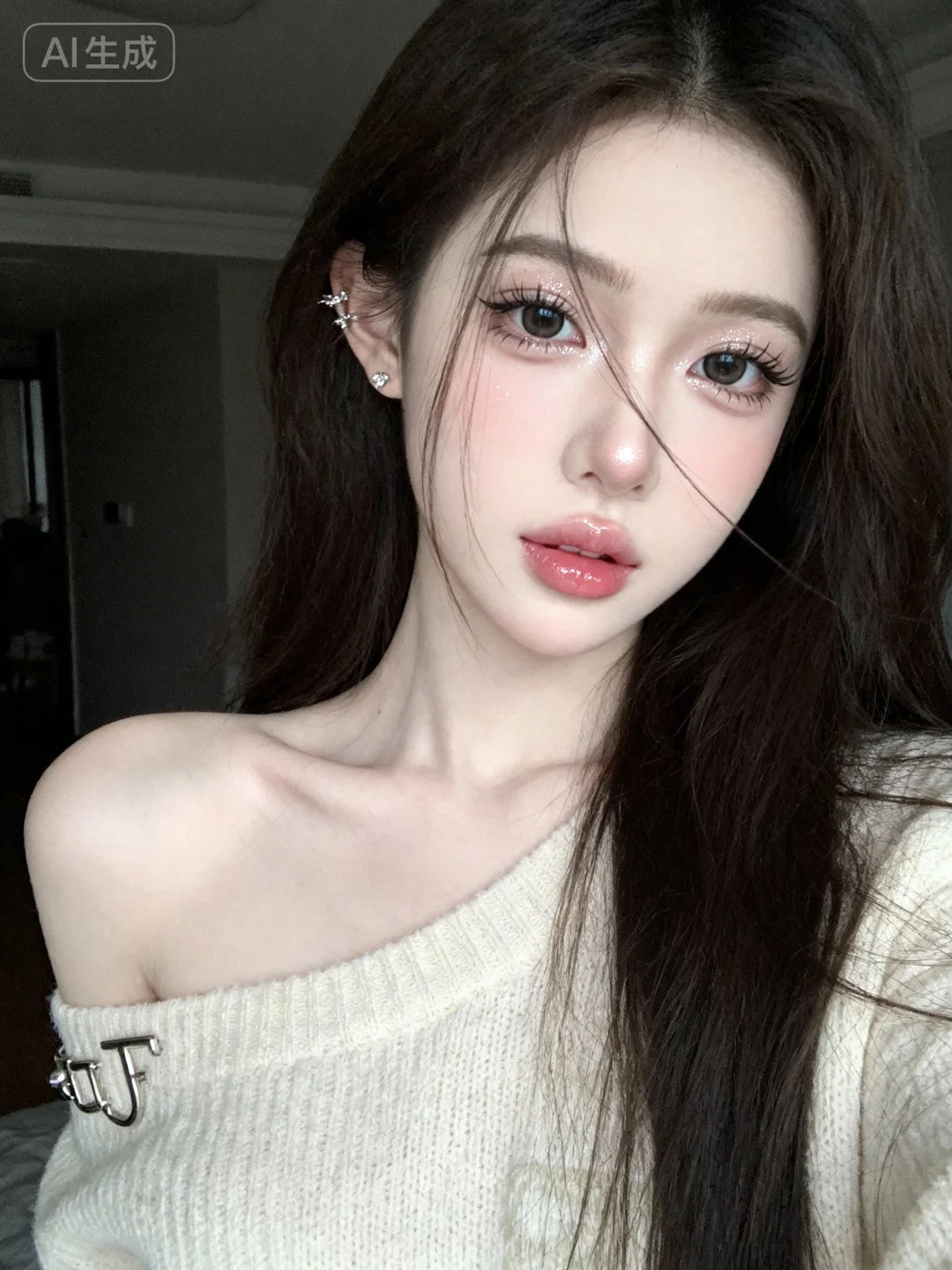 超高颜值骨感甜美女孩,网感头像,远景,瓷白肌肤、奶油白肌肤,稚嫩感,冷白皮,脸部曝光,脸部高光,亮晶晶的鼻子,漂亮的大眼睛,自然卷翘的睫毛,皮肤质感,少女感,网感,无辜大眼睛,微醺,自然松弛,长相貌似像洋娃娃般精致,网感妆,自然光线,暖调滤镜,少女感网拍,概念风美学,情绪氛围感,聚焦眼睛,慵懒氛围感,脸部轻微曝光,独特韵味的美,发丝轻抚脸颊,潮牌单肩毛衣,毛衣带金属装饰,亮晶晶耳饰,可爱表情,樱桃小嘴,唯美长发,室内居家,随手一拍、抓拍,极简留白、空境叙事、低饱和静谧、暗调沉敛、清透疏离,质感弱化、情绪具象、意境优先、简约克制、氛围感主导,氛围感美学,柔焦朦胧、光影氛围感、低饱和氛围感、松弛慵懒感、清透疏离感、暗调静谧感、暖调治愈感、空境松弛感、雾面朦胧感、发丝柔光感,