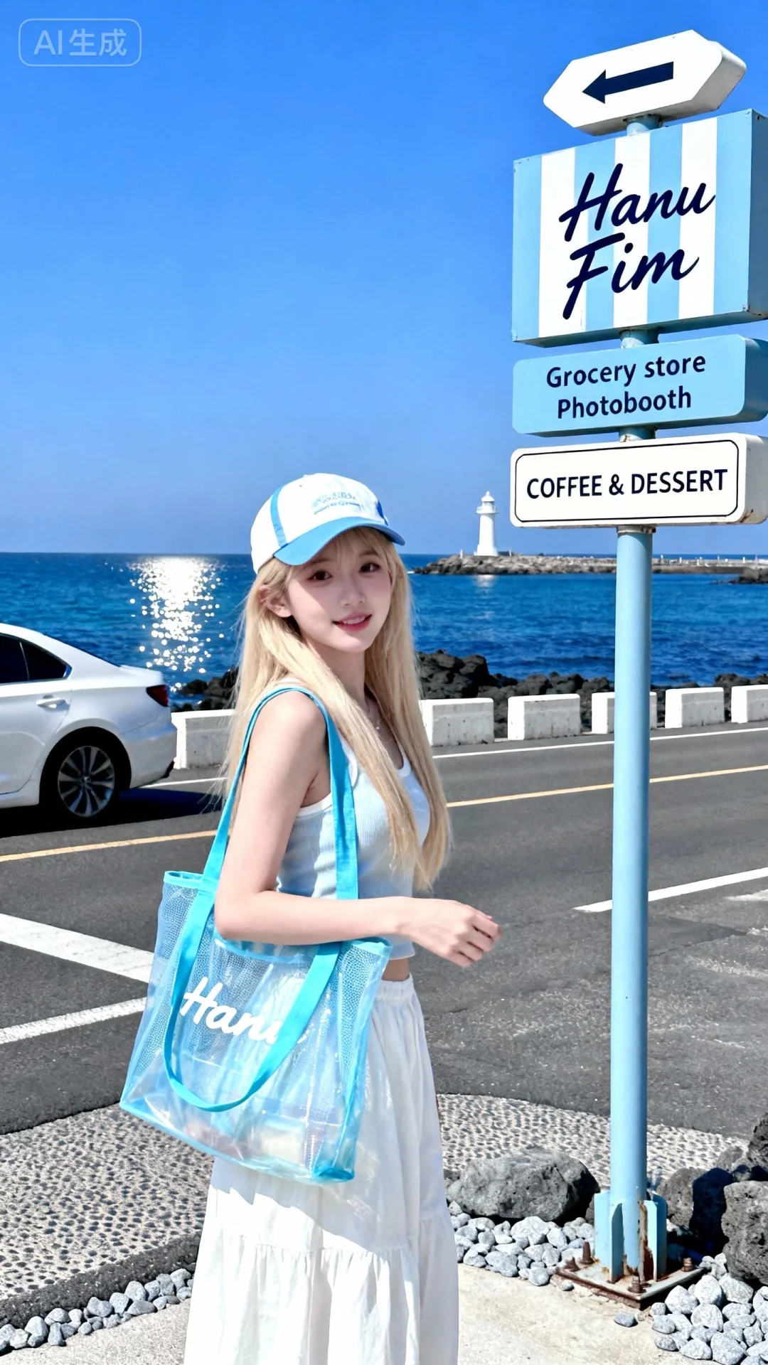 超清晰画质,妆造精致,饰品精巧,可爱妆造,温柔大方,五官精致,面部清晰,(电影级面光:1.6),(光线追踪:1.5),(冷白皮漫感质感的光滑皮肤:1.7),(人物有最好的骨相:1.2),(网感脸:1.6),完美身材,身材完美,莫兰迪配色,高颜值网红,INS风,幼态脸,20岁女生尖下巴,三庭五眼比例均衡,身材娇小,细腻陶瓷水嫩肌肤,偏冷白皮,随机的动作,侧光,随机角度拍摄,总体有很多的不确定性,但又好看, 风格甜美少女系,氛围慵懒俏皮,东方美女,年轻娇小,冷白皮气质美女,薇薇纯欲风,皮肤白皙,偶像气质,fairskin,气质的江南美女子,有点甜美,皮肤美白透亮,表情可爱,甜美氛围,细腻笔触,独特韵味的美,浅金色长直发(发丝柔顺有光泽,头戴浅蓝白色拼色棒球帽;上身着浅色系无袖背心,下搭白色宽松长裙(面料垂坠感强),左肩挎天蓝色透明网纱托特包(包身印白色英文字母,肩带为同色系布艺),手臂纤细,皮肤白皙 场景与环境:海边公路旁的网红路标处,地面是深灰色沥青路面(有颗粒纹理),路边散落浅灰色碎石;右侧立浅蓝色金属杆的多层路标,上层是蓝白条纹牌(手写体“Hanu Fim”),中层浅蓝牌印“Grocery store”“Photobooth”,下层白牌印“COFFEE & DESSERT”,顶部有白色箭头标识;背景是湛蓝色海面(波光粼粼,远处有礁石与白色灯塔),天空是纯净的蔚蓝色(无云),公路旁停白色轿车,护栏为白色水泥材质 光感与质感:正午强烈的自然光,光线偏冷调,阳光直射在海面形成耀眼反光,路标金属杆的哑光质感、网纱包的通透感、棒球帽的棉质肌理清晰;蓝天与蓝海形成高饱和的蓝调撞色,韩系清新写真风格,治愈度假氛围,8K超清,细节拉满 精简版AI绘画提示词 年轻女性背身走在海边公路,浅金长直发+浅蓝棒球帽,白色长