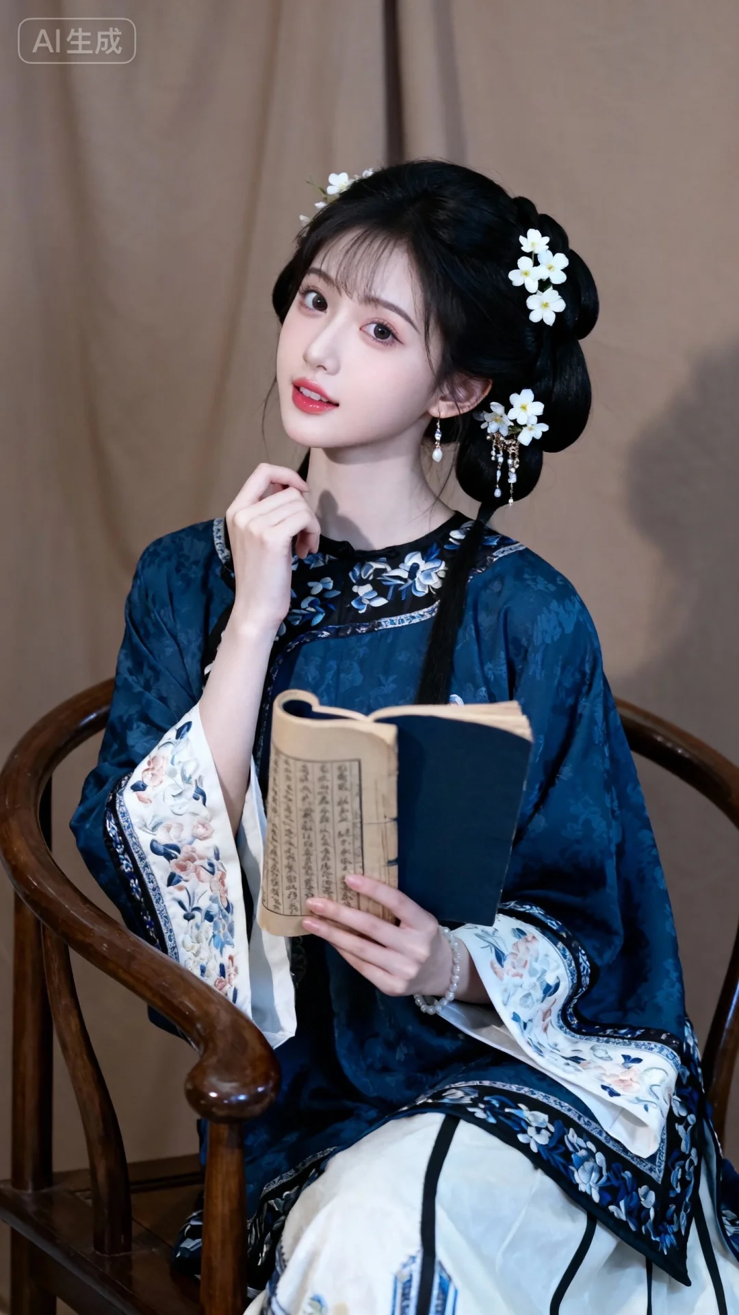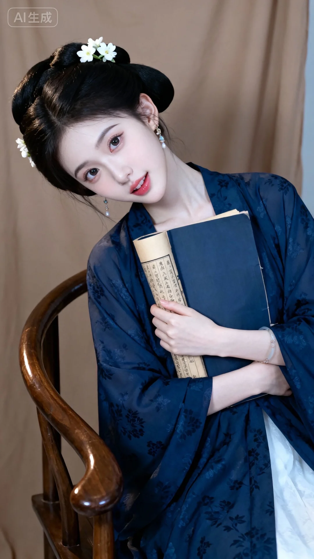 真实摄影,古典书香氛围,黑色盘发(插白色小花),深蓝色暗纹长袍,坐在木质圈椅上,手持书籍,背景为浅棕色纯色幕布,柔和室内光,姿态优雅,透出雅致古典感;古典质感,光线烘托(突出服饰纹理与书籍色彩),人物居于画面中心;盘发的古典、长袍的雅致、古籍的书香、圈椅的传统元素,都透出古典书香氛围;深蓝色暗纹长袍作风格亮点,与古典场景呼应,古典书香氛围感拉满,倾斜构图,容颜绝美,正面照,超清晰画质,妆造精致,饰品精巧,可爱妆造,温柔大方,五官精致,面部清晰,(电影级面光:1.6),(光线追踪:1.5),(冷白皮漫感质感的光滑皮肤:1.7),(人物有最好的骨相:1.2),(网感脸:1.6),身材完美,莫兰迪配色,高颜值网红,INS风,幼态脸,20岁女生尖下巴,三庭五眼比例均衡,身材娇小,细腻陶瓷水嫩肌肤,偏冷白皮,随机的动作,侧光,随机角度拍摄,总体有很多的不确定性,但又好看,
