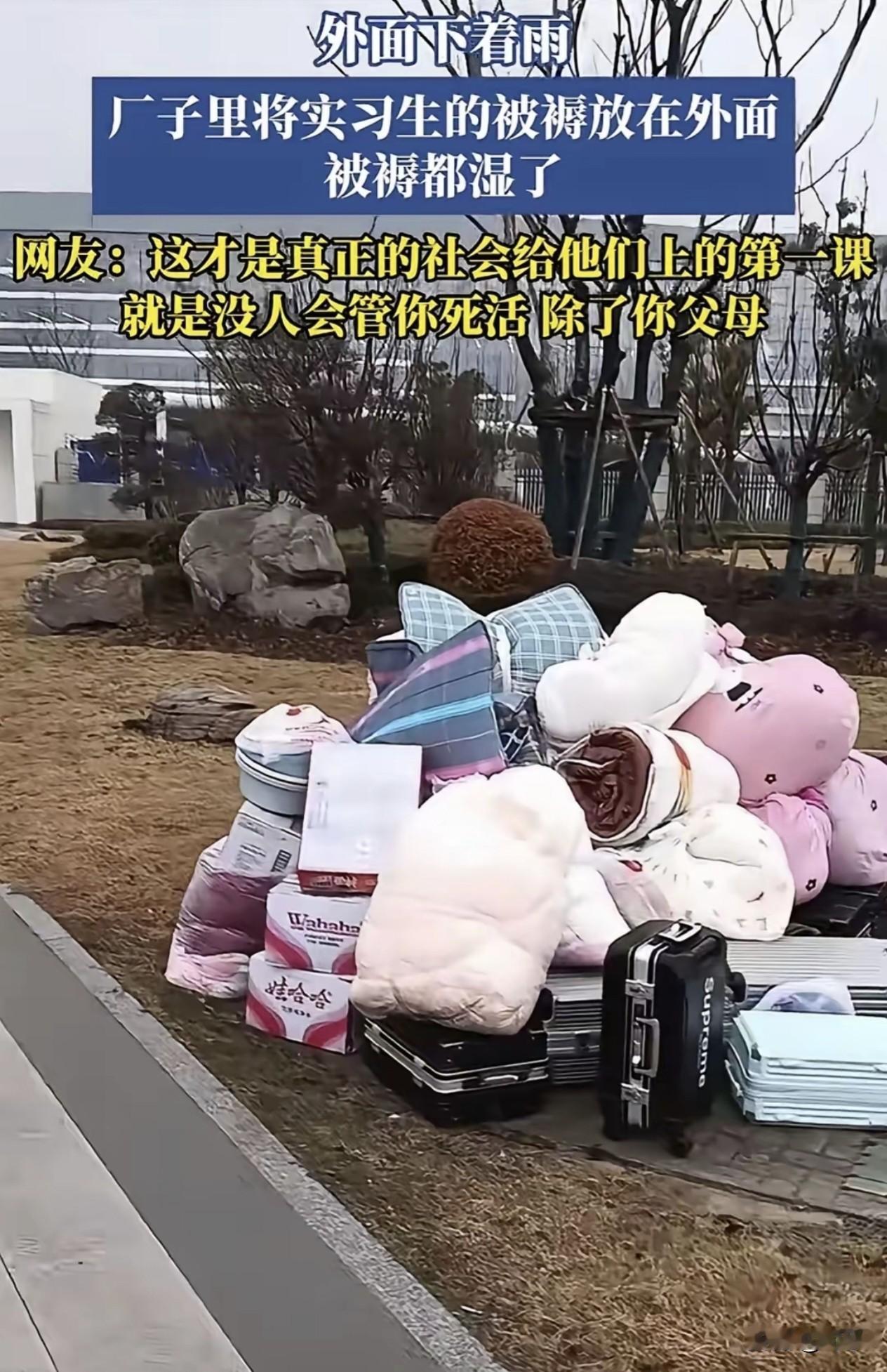 除了父母,没人在乎你。 ​实习期最生动的一课,厂子实习生正在实习,被褥放在外面无人看管被雨水淋湿,没人在乎你晚上是否有被褥保暖,只在乎你是否能完成了工厂的工作任务,就连出去收拾被褥的时间都不肯批准。 ​实习生一边在工厂实习,一边挂念堆在外面被雨水淋湿的被褥,没人关心他们的冷暖,这才是最真实的社会现实。 湿透的被褥在夜里又冷又重。实习生结束漫长的工作后,只能想办法把它弄干,或者盖着衣服凑合过夜。第二天,他还是要准时出现在岗位上。 这些经历让他明白,在外面很多事情要靠自己。他学会了提前做好准备,也学会了遇到困难时自己想办法解决,不再指望别人主动来帮忙。 步入社会意味着要独自面对许多具体而现实的困难。它要求一个人既要完成分内的职责,也要学会妥善照料自己的生活。这种成长虽然艰难,但却是走向自立的必经之路。 实习期感悟 职场新人 成长感悟