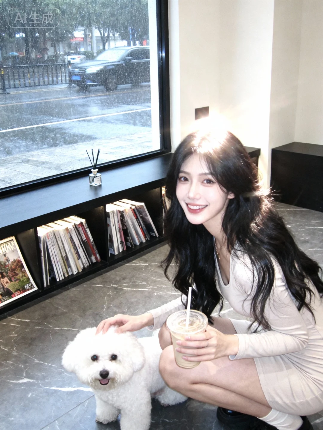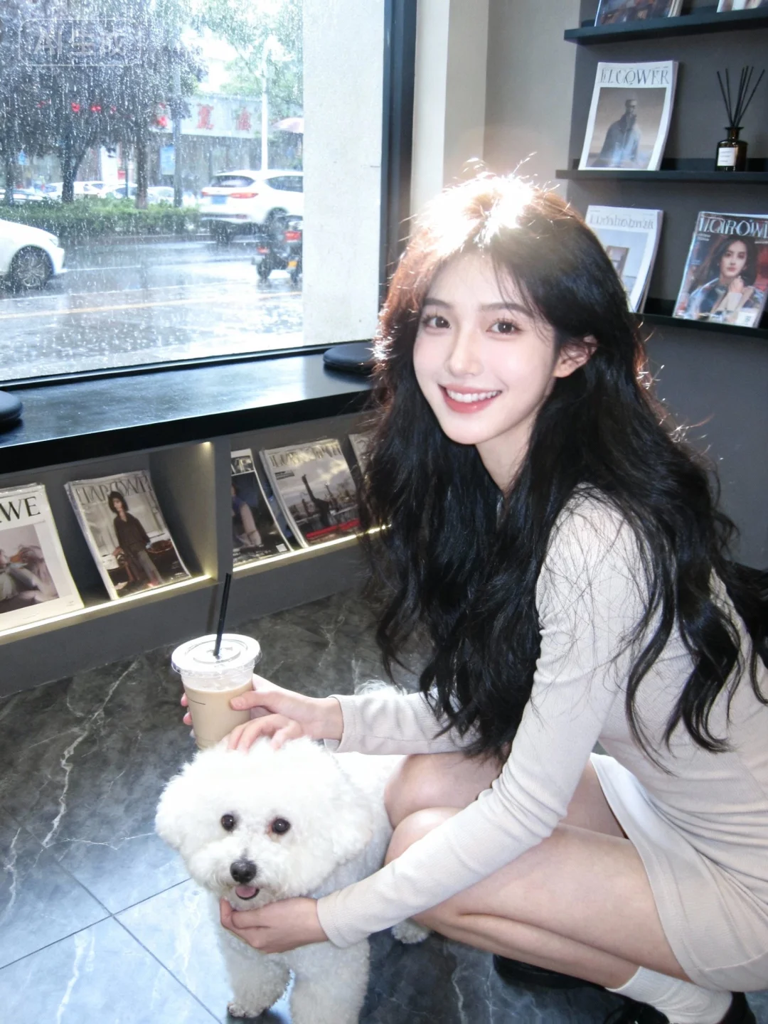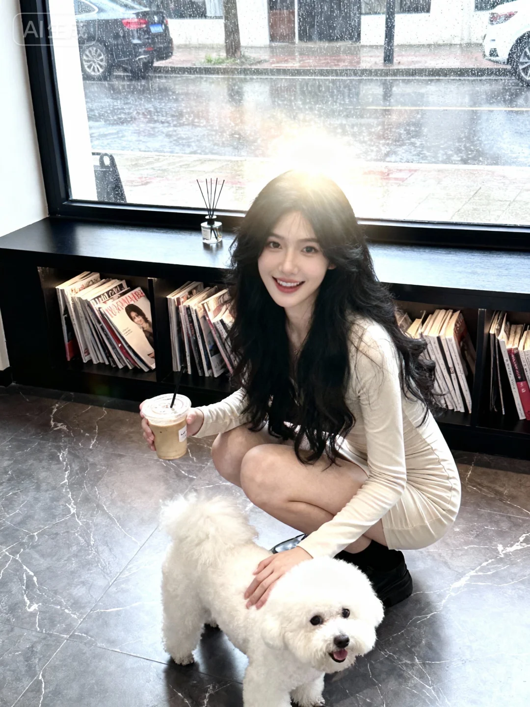 梦幻朦胧感,噪点,微微过曝,动态模糊,商业修图,日常抓拍。发丝光,头顶光,侧光。 漂亮女生,19岁网红,黑色慵懒长发及腰、高鼻梁、瘦身材瘦脸型,背景是文艺风的室内空间里,落地窗正对雨后的街道。窗前黑台。嵌入式书架摆满杂志与香薰,深灰大理石地板,蹲在地上,一只手拿着一杯奶茶,一只手开心的摸着一只白色比熊小狗,穿着一件浅色的长袖修身连衣短裙 近景,半身照,聚焦面部,面向镜头
