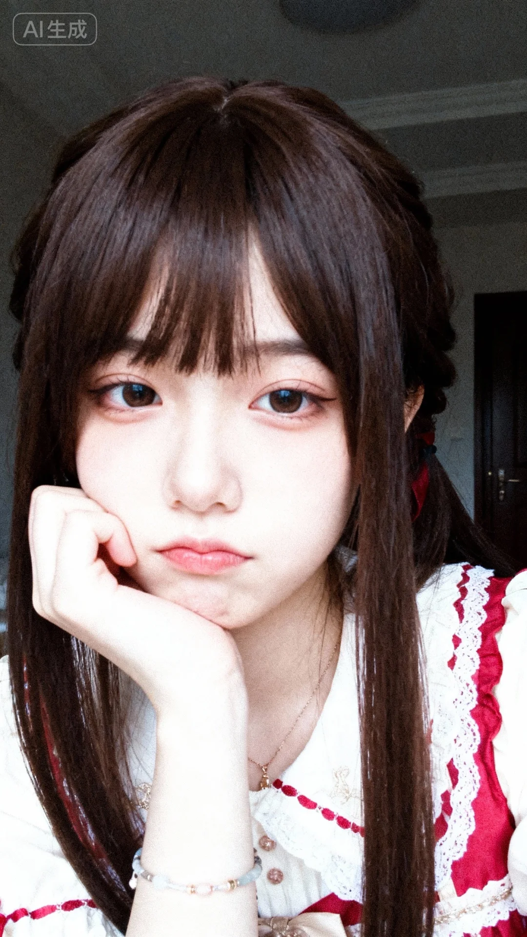 以墨明风格艺术美学呈现画面。画面中的离尘师妹模样极为可爱,有着幼态脸蛋,有着可爱无辜且眼睑下至的眼睛。她拥有深栗棕色森系发型,发丝垂坠且轻抚,瓷感白肌肤,身着艳丽色薄款洛丽塔服装,清纯动人,佩戴简约饰品,露出撇嘴的可爱俏皮娇俏微表情,楚楚可怜。画面聚焦面部,高曝低饱和,整体处于暗调静谧房间的慵懒氛围中,构图平庸,呈现生活快照般的随手一拍抓拍风格。