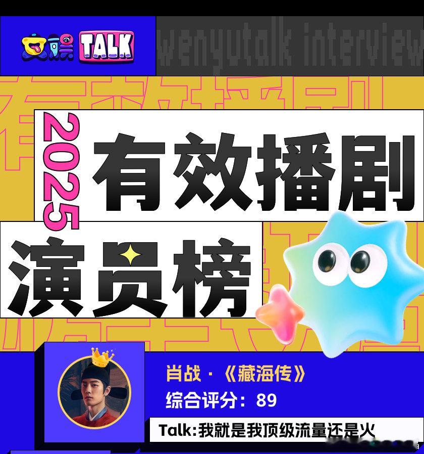 2025有效播剧演员榜第一名是肖战。郑晓龙导演,成长型英雄的视角切入,重塑了权谋叙事的《藏海传》让肖战拿下了2025年有效播剧首席!从文娱 Talk 统计的有效播剧排行来看,肖战凭借一部《藏海传》,演员好评度超过80%,有效播剧分数高达89。其中角色出圈度(角色/演员热度贡献指数)高达99%。好故事好本子就是具备带动演员口碑的效力。