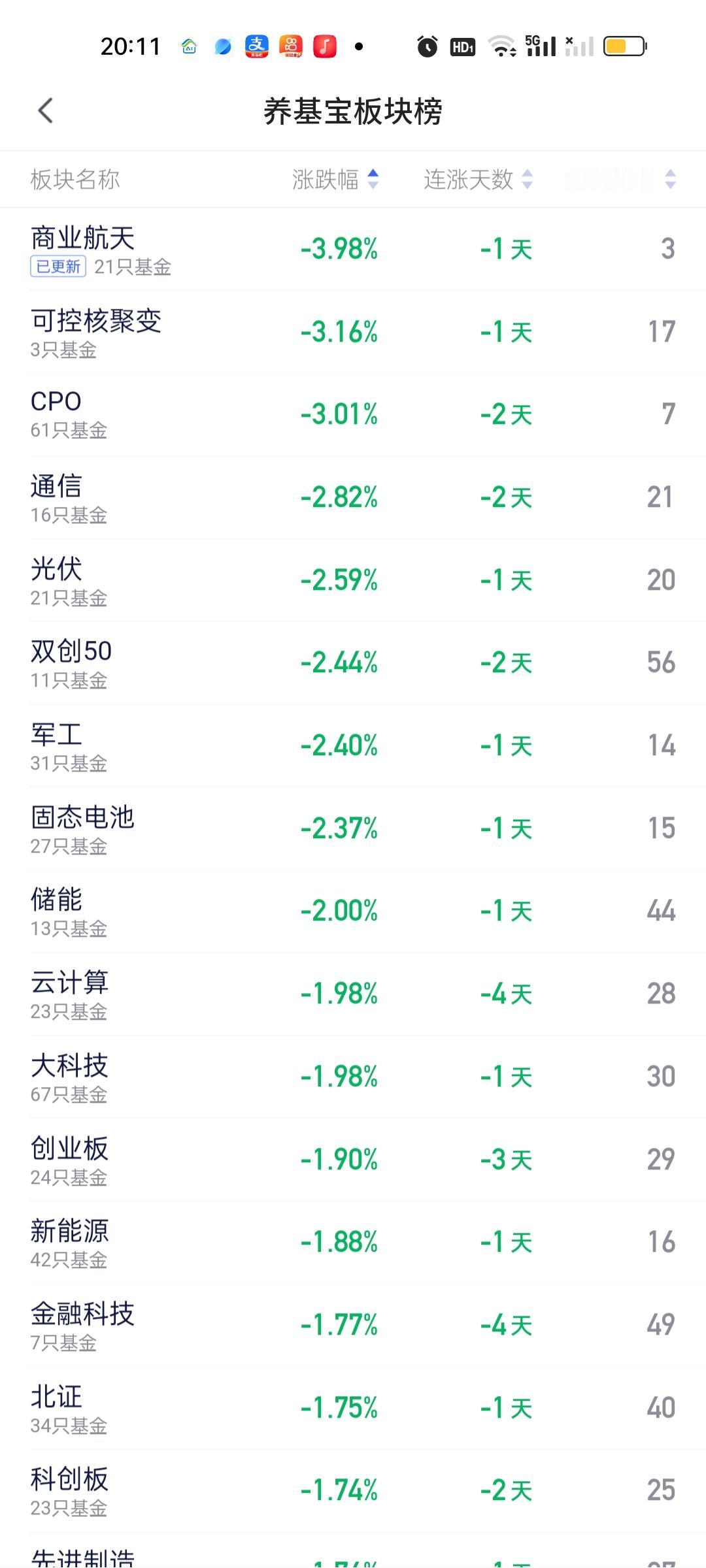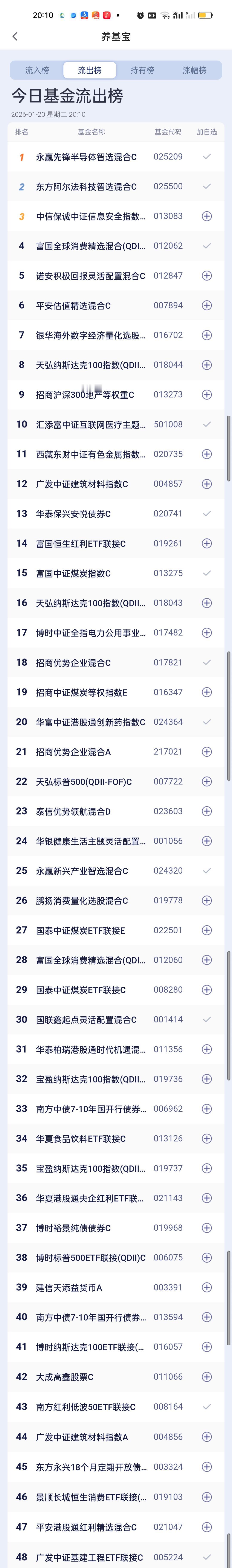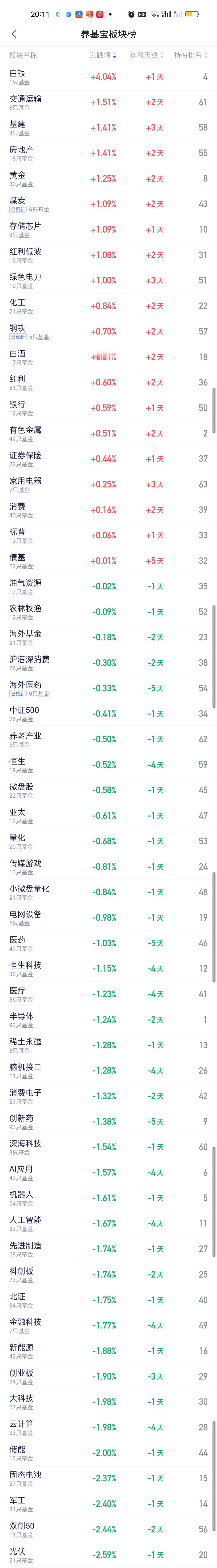 今日基金加仓榜,减仓榜以及板块榜已全部更新完毕。加仓榜前三名是国投瑞银白银期货,方正富邦核心优势,宏利高端装备股票。减仓榜前三名是永赢先锋半导体,东方阿尔法科技智选,中信保诚中证信息安全指数。 板块榜方面,涨幅居前的板块有白银,交通运输,基建,房地产,黄金,煤炭,存储芯片,红利低波,绿色电力,化工,钢铁,白酒。跌幅居前的是商业航天,可控核聚变,CPO,通信,光伏,双创50,军工,固态电池,储能,云计算。