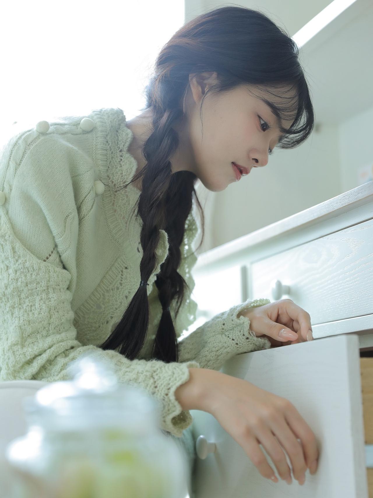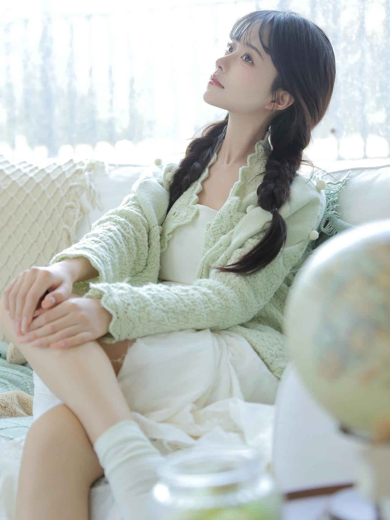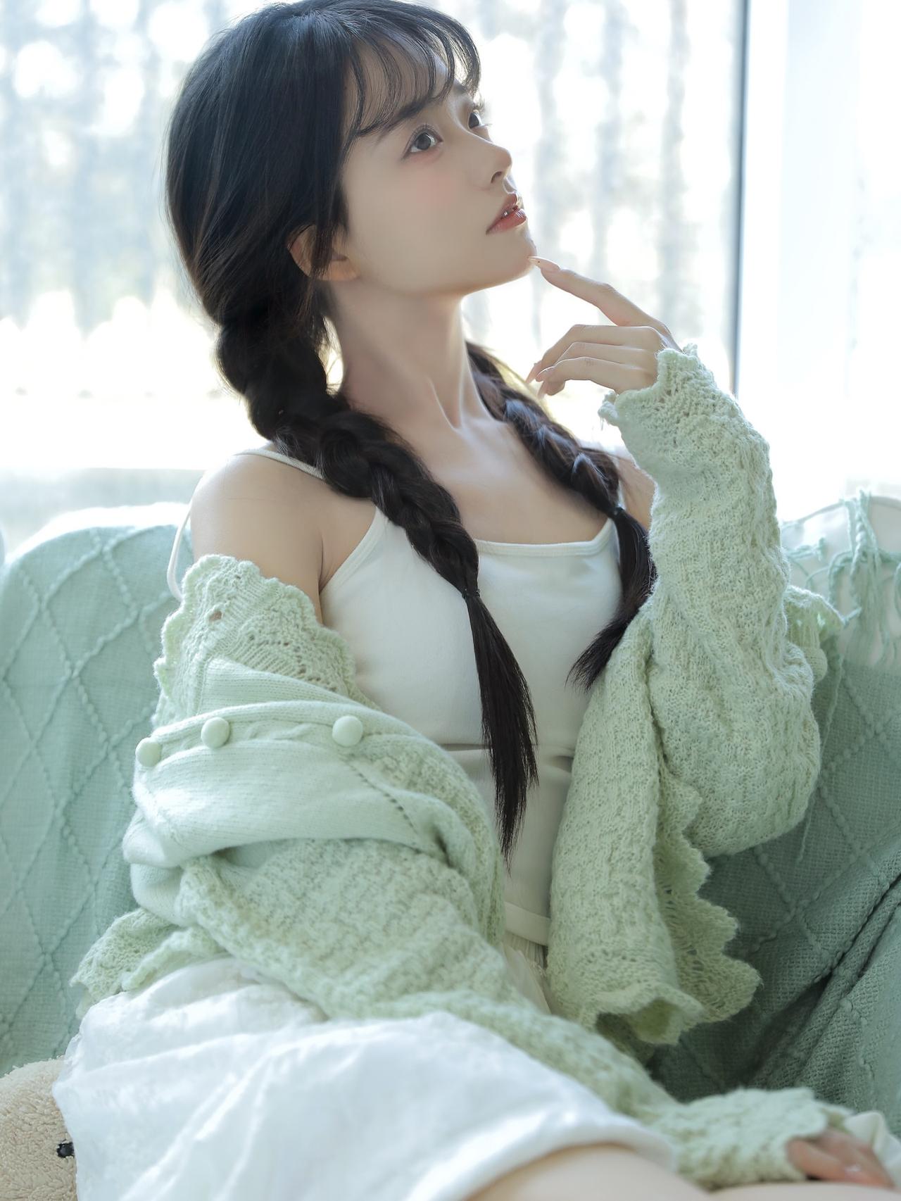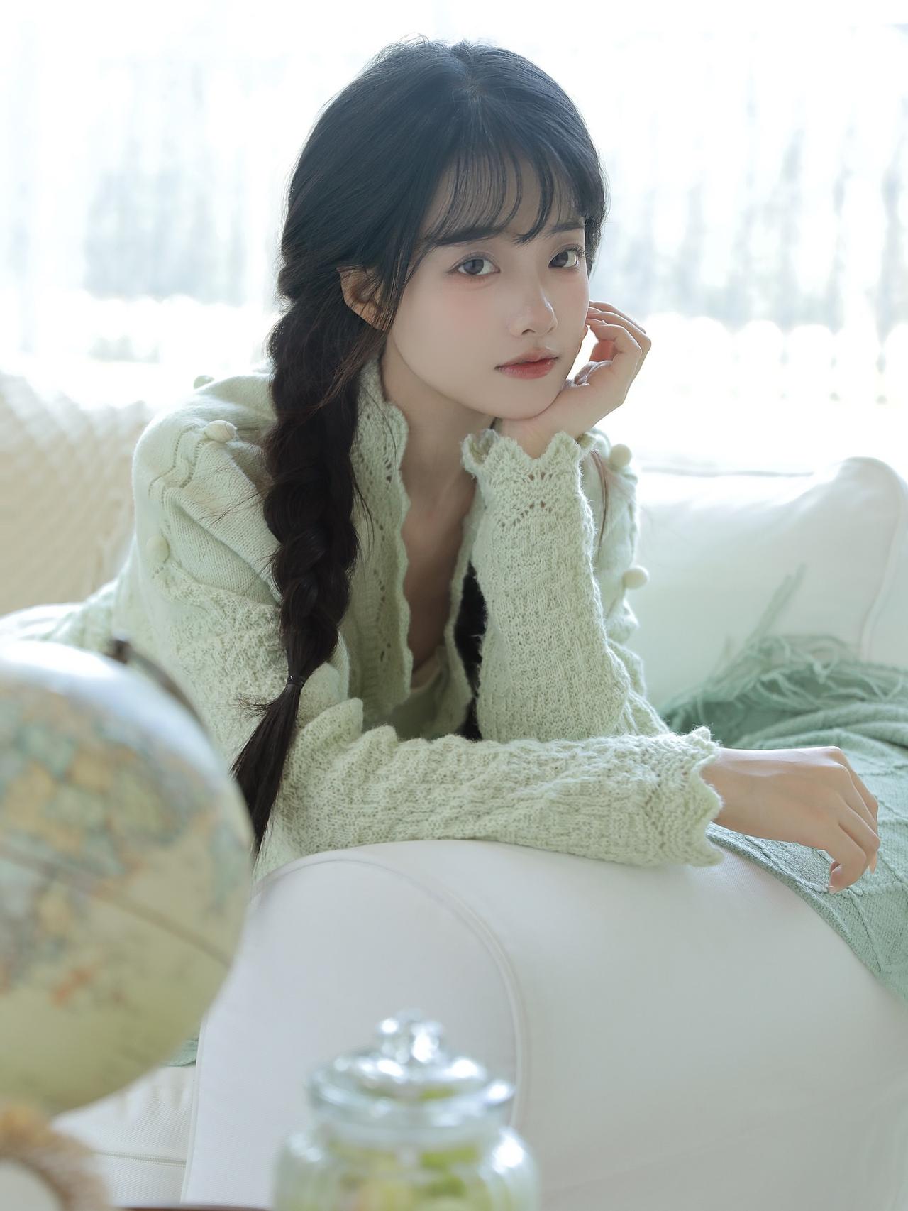 沉思的午后,黑发少女静坐,绿植相伴,时光静好。