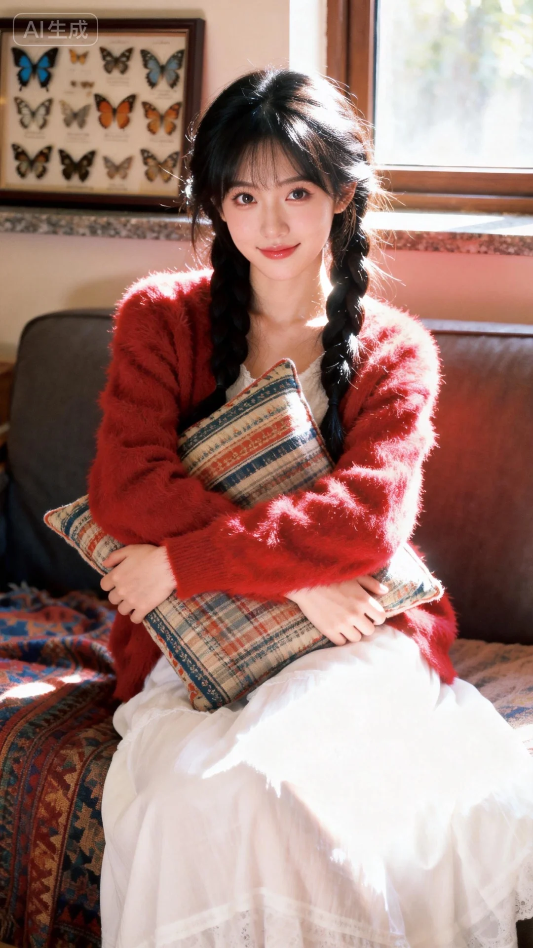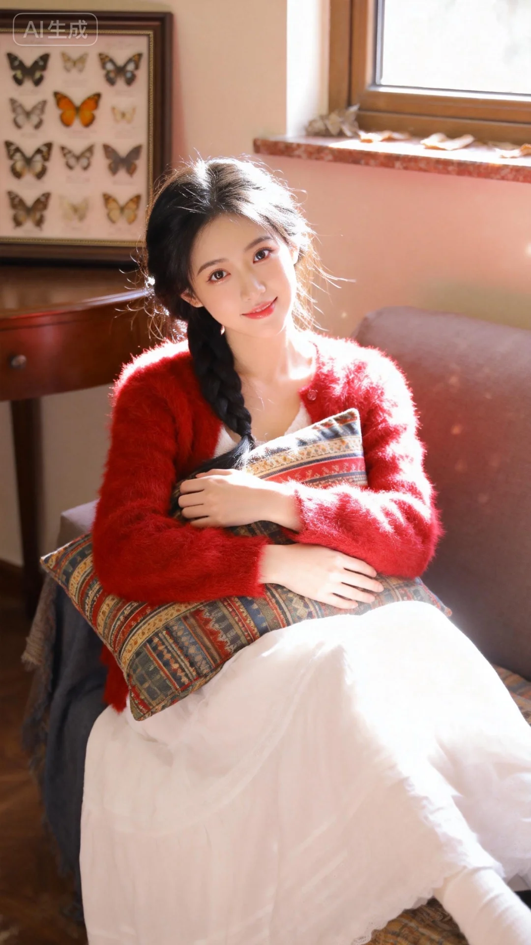 日常生活快照,非常规视角构图,随手一拍。 20岁年轻女性,娇憨可爱,眼神灵动俏皮,皮肤白皙细腻,精致妆容,呈现精细面部细节/最佳面部显示效果。强烈室内光源倾洒在主角头发/身上/脸上,光影特效:光斑流动/明暗渐变。 - 头部、身体及手脚姿势:坐姿,身体微侧,双手抱靠垫 - 眼神及表情:眼神灵动,自然表情 - 发型发色:黑色长发,编发造型 - 穿搭:红色毛绒外搭,内搭白色长裙,带装饰靠垫 - 互动道具:无 - 环境场景:室内,蝴蝶标本装饰画、窗台、沙发背景一位漂亮的亚洲女生,大眼睛双眼皮,大方得体,端庄,自信,绝美容貌,长长的睫毛,微红的嘴唇,柳眉纤细,眼眸深情深邃,悬胆鼻,樱桃唇,女子五官、妆容精致,皮肤白皙,年轻貌美,完美身材,比例协调,神情温柔羞怯,每一处细节都仿佛是经过时光雕琢的艺术品。她的表情平静,如同静谧的湖水,超高清细节,整体光线亮白,真人真实写真风格,真实场景。超清晰摄影大师用光。超广角镜头,远景,全身照,有氛围感,超精细,细节丰富,色彩丰富多彩,超高清画质32k,摄影作品。