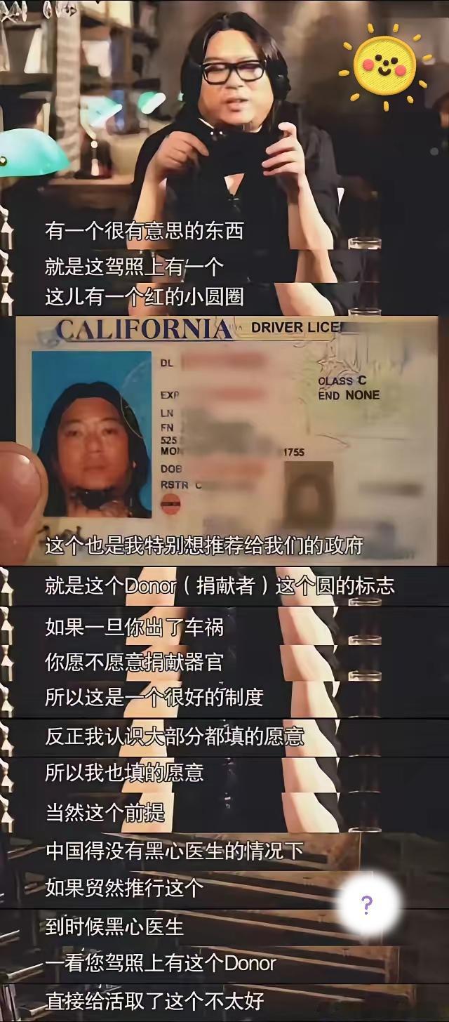 高晓松当年吹的美国器官捐献制度, 现在看简直细思极恐! 当年他拿着美国驾照,把“Donor”标签吹成人性光辉, 呼吁大家都勾选, 可真相哪是这么美好。 法医助理牢A的爆料直接戳破滤镜: 身体健康的中国年轻人, 在美国器官黑市上价值连城。 更可怕的是美国的“循环死亡后捐献”模式, 死亡判定全凭医生主观判断, 有患者被宣告死亡后开胸时心脏还在跳, 甚至有人手术台上三次苏醒挣扎。 所谓的“善意制度”, 不过是资本裹挟下的利益游戏, 公知们的美化宣传, 差点让无数人掉进陷阱。 真正的文明从不是口号包装, 而是对生命的敬畏与制度的透明。 你身边有人曾被公知误导过吗? 如果要去国外办证件, 你会特意留意器官捐献这一栏吗?