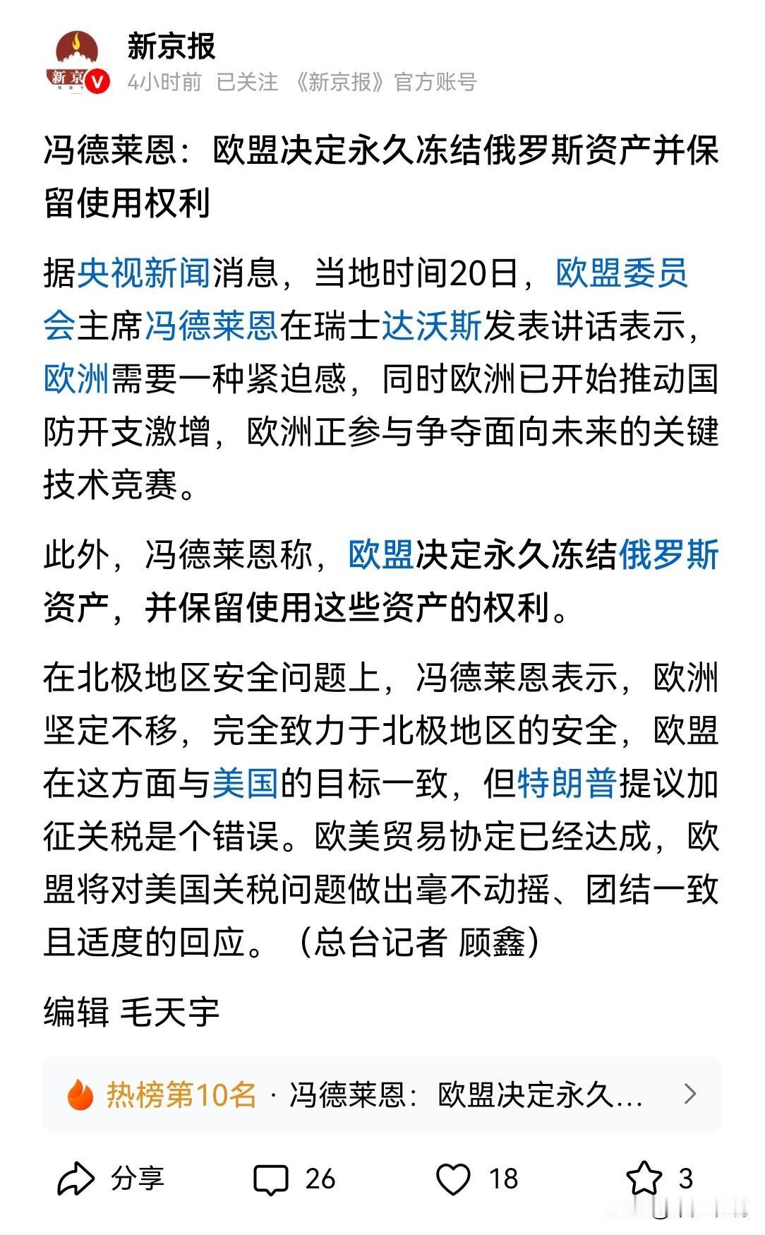 欧盟真是外强中干,踩俄罗斯就拼命,舔美国也拼命 欧盟今天决定永久冻结俄罗斯资产,并保留使用这些资产的权力。 欧盟现在不想着应对美国要强取格陵兰岛,而还在幻想着俄罗斯会攻到欧洲本土。这就是典型的外强中干。