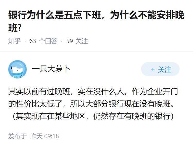 银行为什么是五点下班,为什么不能安排晚班?