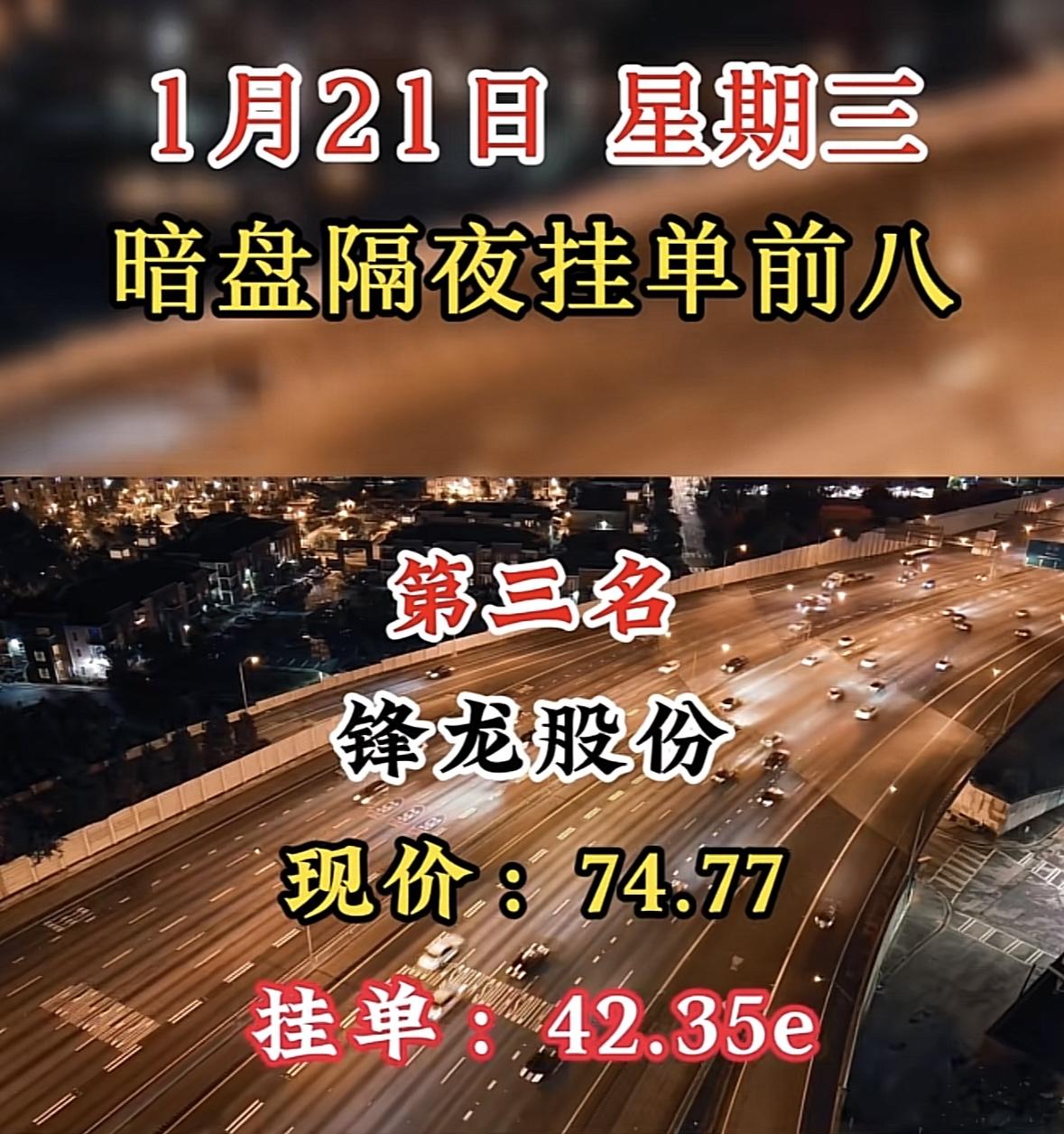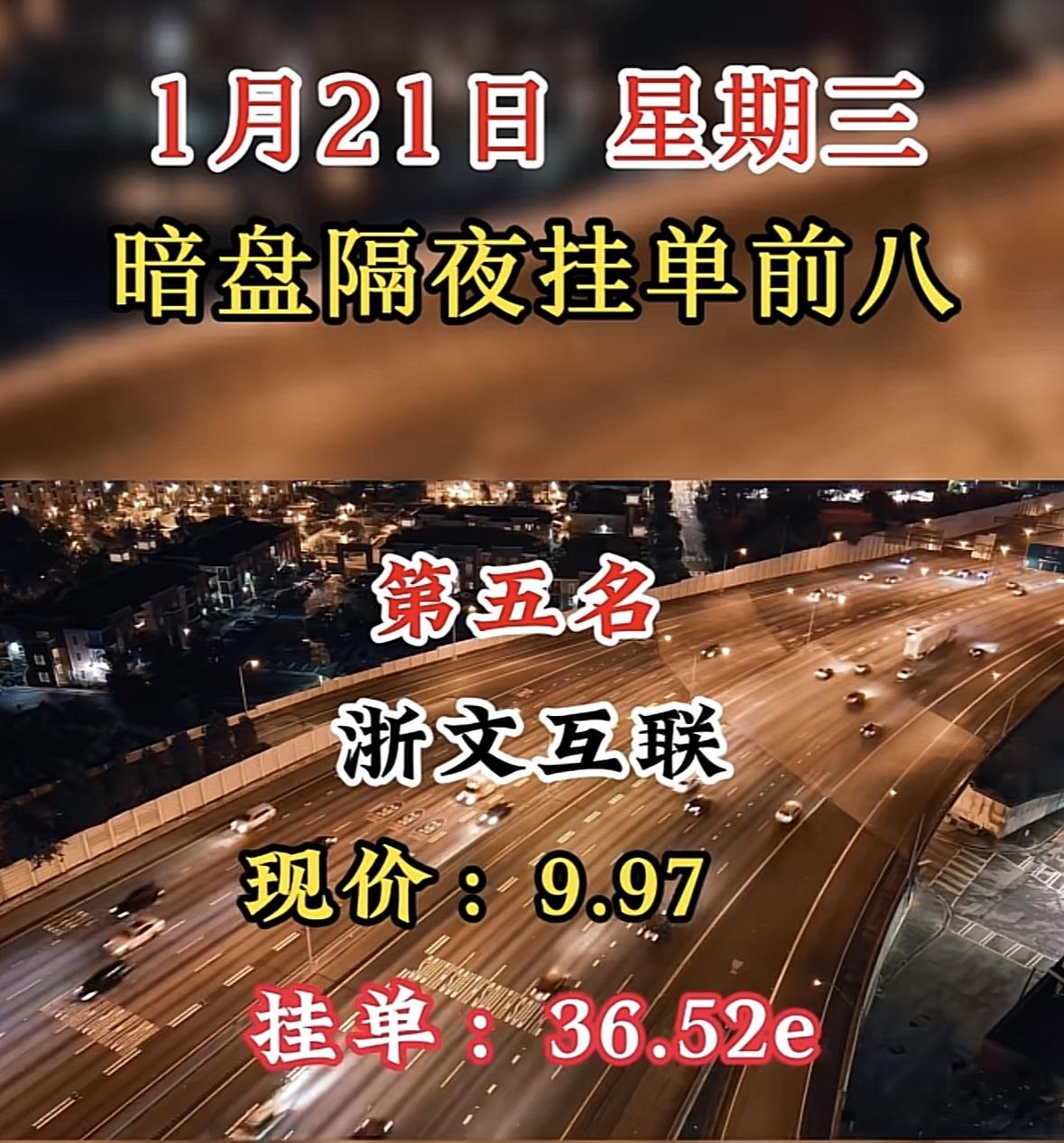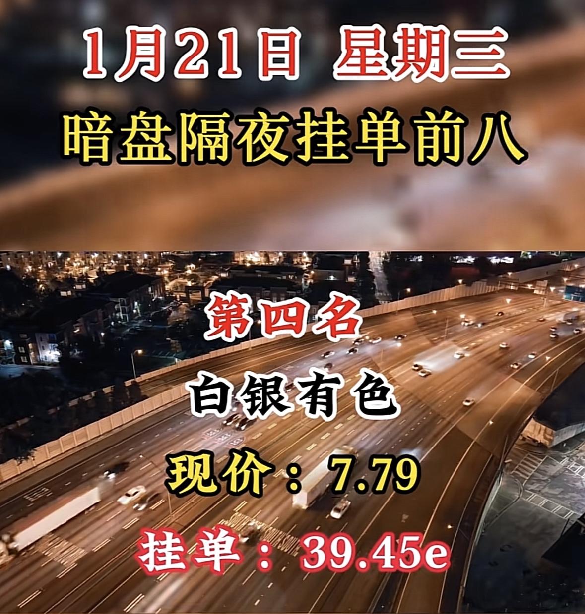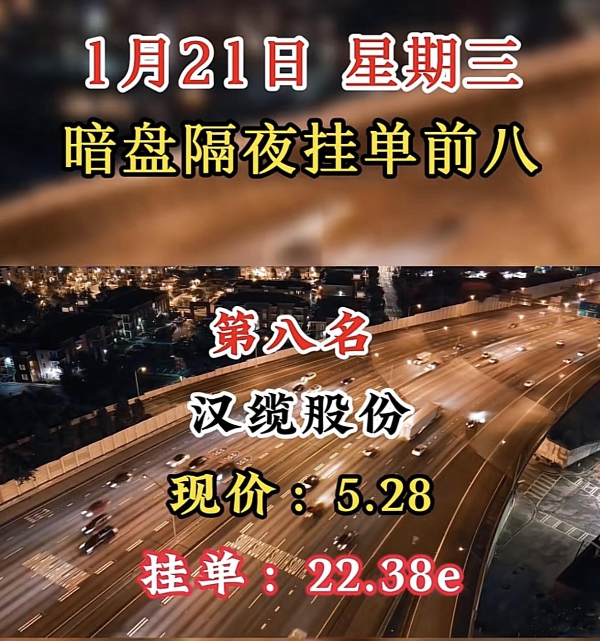 “1月21日暗盘隔夜挂单前八”股票分析,汉缆股份现价5.28,挂单22.38e 白银暗盘领跑,挂单量遥遥领先,市场热度高涨。 "湖南白银暗盘领跑,挂单活跃显热度,市场关注度攀升。"