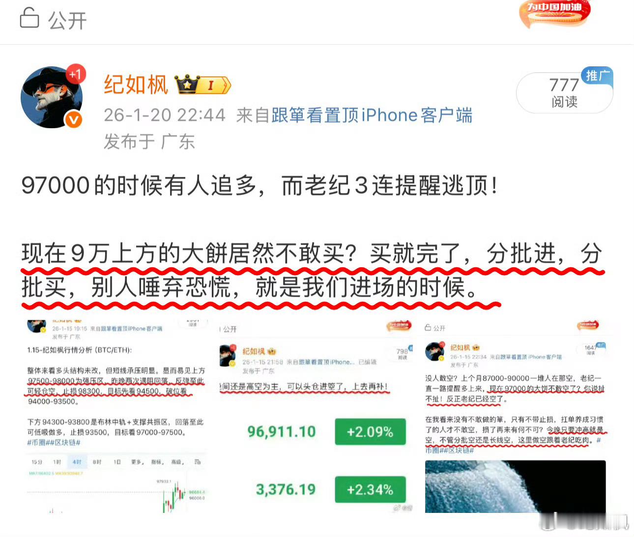 97000的时候有人追多,而老纪3连提醒逃顶!现在9万上方的大餅居然不敢买?买就