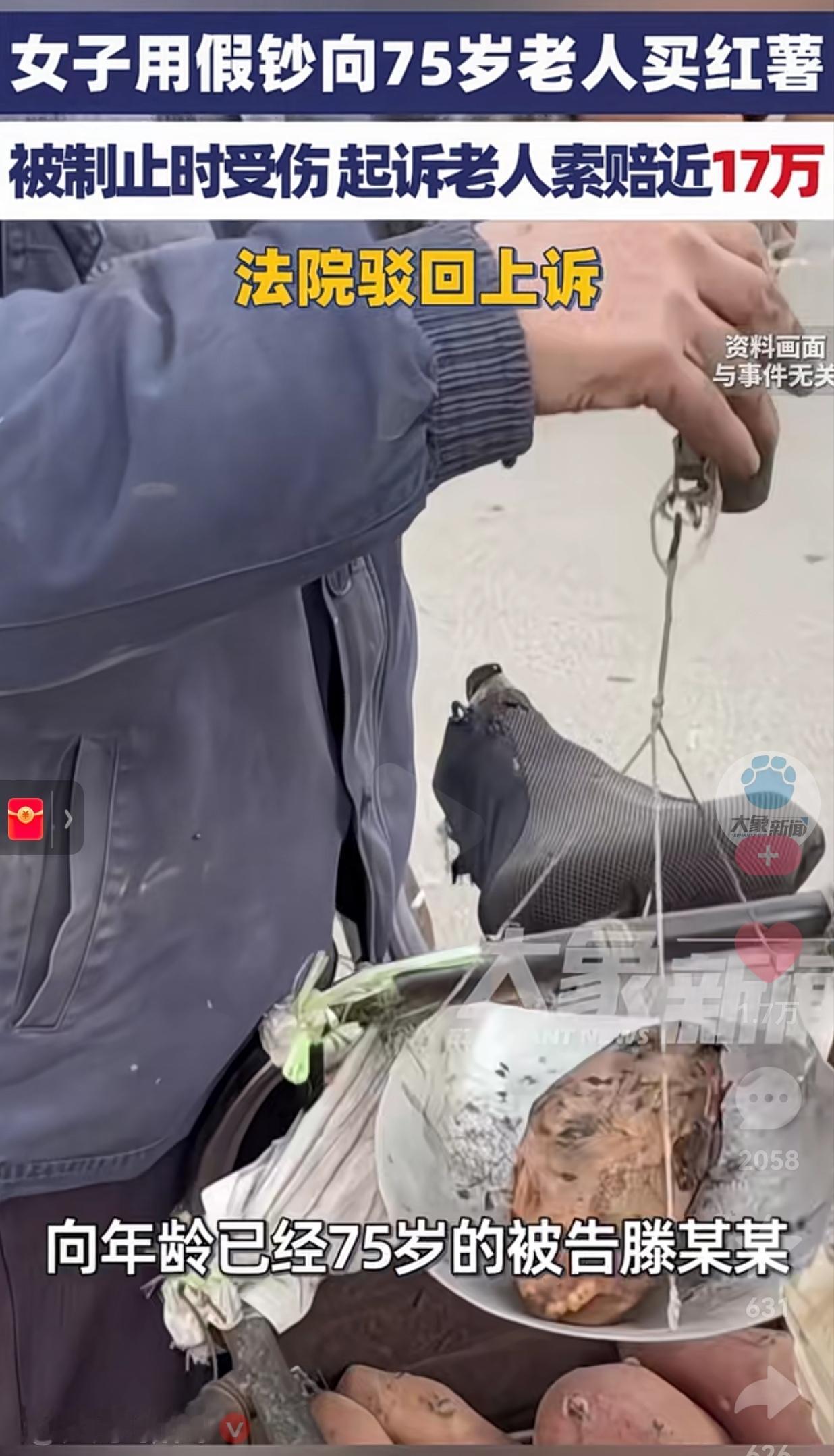 真的是不知羞耻,怎么好意思告人家呢?2023年2月17日,一位75岁的老人在农贸市场卖红薯,遇到一名女子买红薯,结账时女子用假钞结账。 老人发现后,和女儿一起把女子扭送派出所,在制止过程中女子面部受了伤。 民警赶到现场后,查实这名女子非法持有和使用假钞600元,直接对她处以行政拘留7日的处罚。 本以为这件事情到这里就告一段落了。没想到的是,这名女子非但没有悔改,反而以健康权受到侵害为由,把老人和他的女儿告上法庭,索赔近17万元。 最终,南京市浦口区人民法院驳回了她的上诉,明确认定老人和女儿的行为属于正当的自助行为,让这个恶人自食恶果。 此事传到了网上,引发了无数网友的热议,有的网友说:“用假钞骗老人,到头来还有脸敢索赔17万?这脸皮简直比城墙还厚!” 还有的网友说:“法院驳回得好!就该让这种恶人自食恶果,别想钻法律空子。”  女子真的太可气了!你也不想一想,老人年龄这么大了,你怎么好意思欺骗人家呢?对于你来说,600块钱可能不算啥,可能是老人好几天的营业额,咱做人得凭良心。 更让人愤怒的是,女子被拘留后竟然倒打一耙,索要巨额赔偿。这种“我弱我有理”的逻辑,简直是对法律的公然挑衅。她以为自己受伤了就能颠倒黑白,却忘了法律的底线不容践踏。  幸好,法院的判决给了老人及女儿一个公道。它不仅驳回了女子的无理要求,更明确告诉我们:正义不会迟到,法律也不会保护坏人。 话说,如果你遇到这种用假钞欺负老人的人,会像这位老人和他女儿一样站出来制止吗?