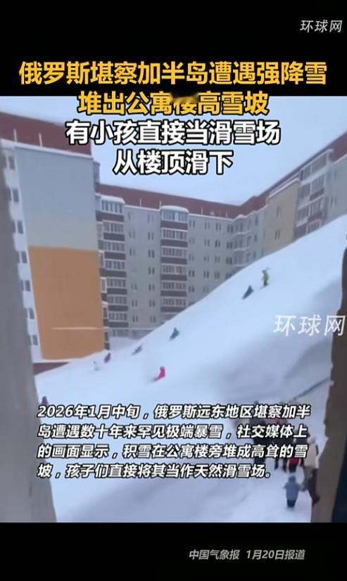 真不愧是战斗民族啊,一场数十年不遇的暴雪直接把城市给“焊”在了雪里,但俄罗斯人居然把高楼当成滑雪场,小孩直接从楼顶往下滑。 从1月12号开始,狂风卷着暴雪连刮好几天,到17 彻底“杀疯”了,市区里平地积雪就有1.71米,差不多到成年人胸口。 更离谱的是背风的楼边,雪堆直接堆到数米高,差不多能没过两层楼,局部区域雪堆更高,几乎快贴近低层楼顶,简直离谱到家。 而狂风就像个不要钱的搬运工,把雪硬往建筑缝里塞,公交直接趴窝学校全停了课,飞机也飞不起来,整个城市的交通彻底瘫痪。 好多居民被困在家里,想出门只能从窗户跳进雪堆,还得自己动手挖雪隧道,才能找到被埋的车。 更让人揪心的是,已经有2人因为屋顶积雪塌了不幸出事,当地政府紧急宣布进入紧急状态。 就在全城忙着铲雪救灾的时候,一段视频突然刷爆了,公寓楼旁堆起的高耸雪坡,直接成了熊孩子们的免费滑雪场! 他们从楼顶“嗖”地一下滑下来,笑声混着风雪声,在一片狼藉的城市里又魔幻又治愈。 如今一边是大人挖隧道、铲积雪的狼狈,一边是孩子在雪坡上撒欢的快乐,这种反差看得人又心酸又想笑。 不得不说,战斗民族的娃是真的硬核,都这时候了还能整出乐子来! 不过玩笑归玩笑,这场暴雪也给所有人提了个醒,极端天气越来越多,谁也不知道下一次“楼顶滑雪场”会出现在哪儿。 咱们普通人除了看热闹,也得提前做好准备,毕竟谁也不想体验“出门靠刨、回家靠爬”的日子。 这场暴雪既是一场灾难,也让我们看到了普通人的韧性,生活再难总能在雪地里挖出点甜来。 希望当地居民能快点恢复正常生活,也希望这样的极端天气能少一点,再少一点!