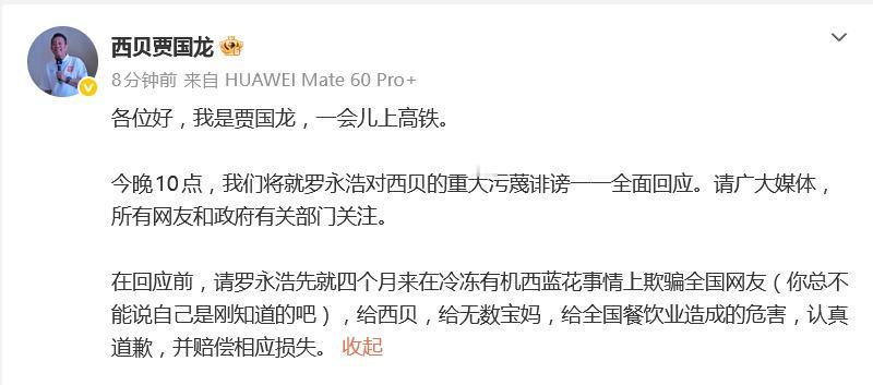 贾国龙称「就罗永浩的重大污蔑诽谤一一回应」,并要求其对西贝、宝妈、餐饮行业道歉,如何看待这一发声? 1月16日晚,贾国龙通过西贝人心声发文:“自去年9月10日至今,我本人和公司所有员工,没有针对罗永浩报过一次警,这些年西贝依法纳税合法经营,从来没搞过任何蝇营狗苟之事。我妻子张丽平报的唯一一次警,是我全家被人肉,连不到五岁的小孙女信息都被挖出来,妻子到香山派出所报警。” 1 月 16 日,西贝贾国龙最新发文,全文如下: 各位好,我是贾国龙,一会儿上高铁。 今晚 10 点,我们将就罗永浩对西贝的重大污蔑诽谤一一全面回应。请广大媒体,所有网友和政府有关部门关注。 在回应前,请罗永浩先就四个月来在冷冻有机西蓝花事情上欺骗全国网友(你总不能说自己是刚知道的吧),给西贝,给无数宝妈,给全国餐饮业造成的危害,认真道歉,并赔偿相应损失。 此前罗永浩发长文: ------------------------------------ 事已至此,贾国龙现在不是做给消费者看的,是做给(已经夭折的上市公司)股东看的。 现在全世界最希望西贝不要横死的就是罗永浩了。 现在全世界想找罗永浩麻烦的人里面,贾国龙是最无关紧要的一个了。 罗永浩如果可以穿越,他连甩自己十八个耳光也不会发那条吐槽的。
