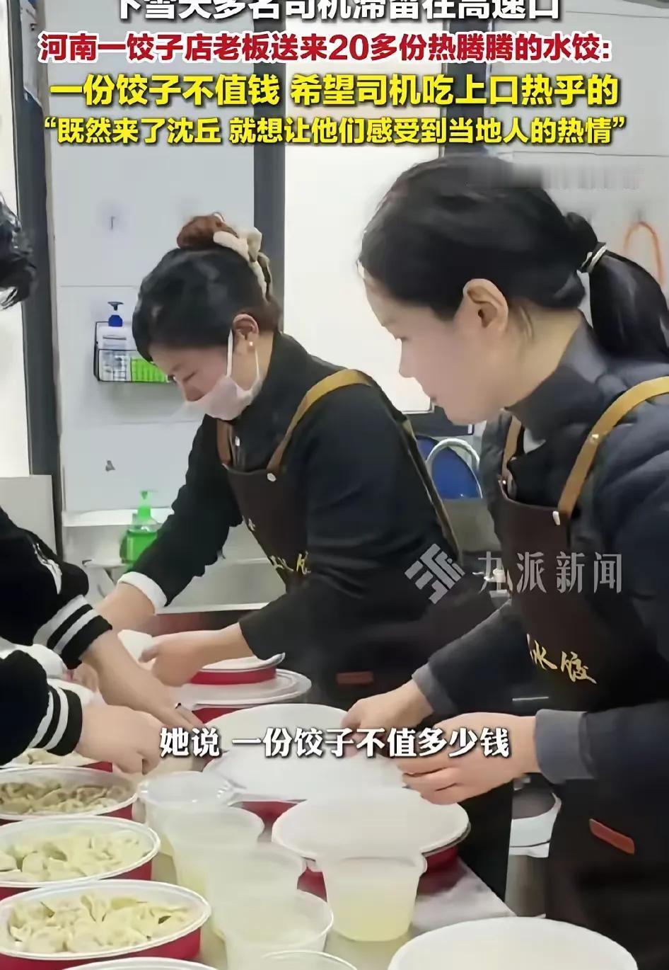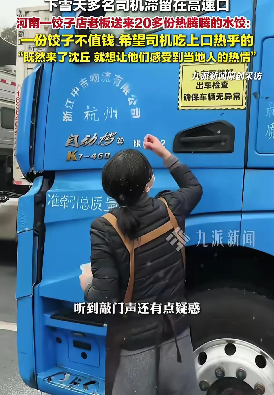 破防了!1月19日,河南周口沈丘下了大雪,不少货车司机被迫停在了高速路口,开水饺店的孟女士知道后,煮了几十份饺子,开车冒雪赶到高速路口,给货车司机免费送上热水饺,让他们在寒冷的冬天吃上了一口热乎饭,天气虽冷,但每个人心里都暖暖的。 那天的雪下得又急又密,没一会儿高速路面就积起了厚冰,往来的大货车一辆接一辆地停在入口处,纹丝不动。司机们缩在驾驶室里,盯着窗外白茫茫的一片,手里的泡面泡了又凉,凉了又泡,连口热汤都喝不踏实。孟女士的饺子店就在高速口附近,隔着玻璃看见这场景,心里一下就揪紧了。她没多想,转身就跟店里的员工喊:“别收拾了,赶紧多包点饺子,煮上几十份,给师傅们送过去。” 店里的几个大姐手速飞快,擀皮的擀皮,调馅的调馅,没一个人抱怨。后厨的锅一直开着,热气裹着面香飘得满街都是。孟女士自己也系上围裙,蹲在地上往保温箱里装饺子,还不忘塞几杯热豆浆。雪粒子打在她的羽绒服上,很快就积了薄薄一层,她却像没察觉似的,只顾着把箱子盖紧。 到了高速口,她踩着打滑的路面,挨个敲货车的车门。司机们大多是跑长途的汉子,隔着玻璃看见一个陌生大姐递来热饺子,先是愣了几秒,接着红了耳根。有个师傅搓着手不好意思接,孟女士就把保温盒往他怀里塞:“拿着吧,一份饺子值不了啥钱,既然到了沈丘地界,就得让你尝尝咱这儿的热乎气。” 孟女士的饺子也不是什么山珍海味,就是白菜猪肉馅的,咬开一口却烫得人眼眶发热。这热乎劲,不止是饺子的温度,更是普通人遇上难处时,递过来的那点实在的善意。 我们总在说“人情味”,其实它从来都不在宏大的叙事里,就藏在雪天的一碗热饺子里,藏在陌生人递来的一杯热水里。比起那些动辄上热搜的流量事件,孟女士的举动没什么惊天动地的,却让我们看见,最扎实的温暖,往往来自最朴素的人心。 各位读者你们怎么看?欢迎在评论区讨论。