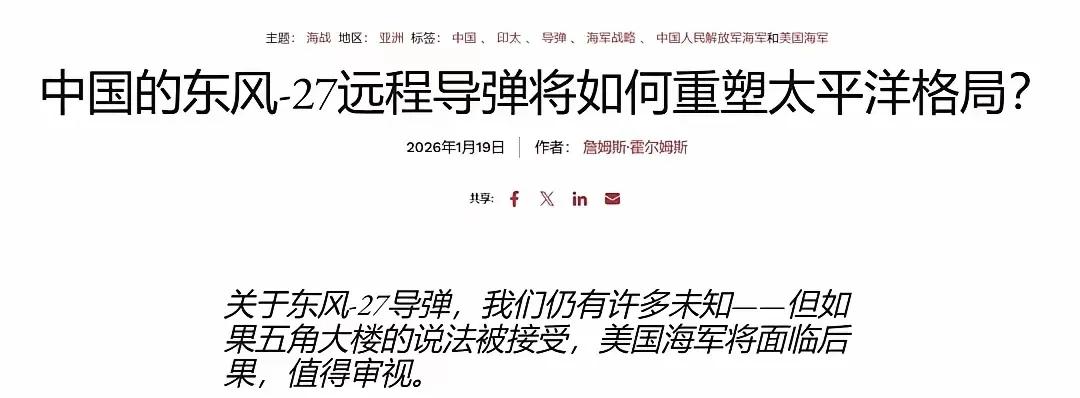 1月21日,据美国媒体报道,近日,美国军事专家霍姆斯(图1)表示,中国🇨🇳未来可能会针对美国建立岛链战略围堵美国,他说据美国五角大楼报告,东风一27反舰弹道导弹已确认进入到战备值班状态,标志着中国🇨🇳在高超音速弹道导弹武器领域取得实质性突破,美国军事专家对此从轻视转向认知。 美军方称,中国🇨🇳东风一27高超音速弹道导弹射程8000公里范围内所有的军舰都被精准命中,核常兼备,末端速度达到10一15马赫,美国任何导弹防御系统无法拦截。 中国🇨🇳东风一27高超音速弹道导弹真象美国军事专家讲得这么利害吗?我们持续关注吧!