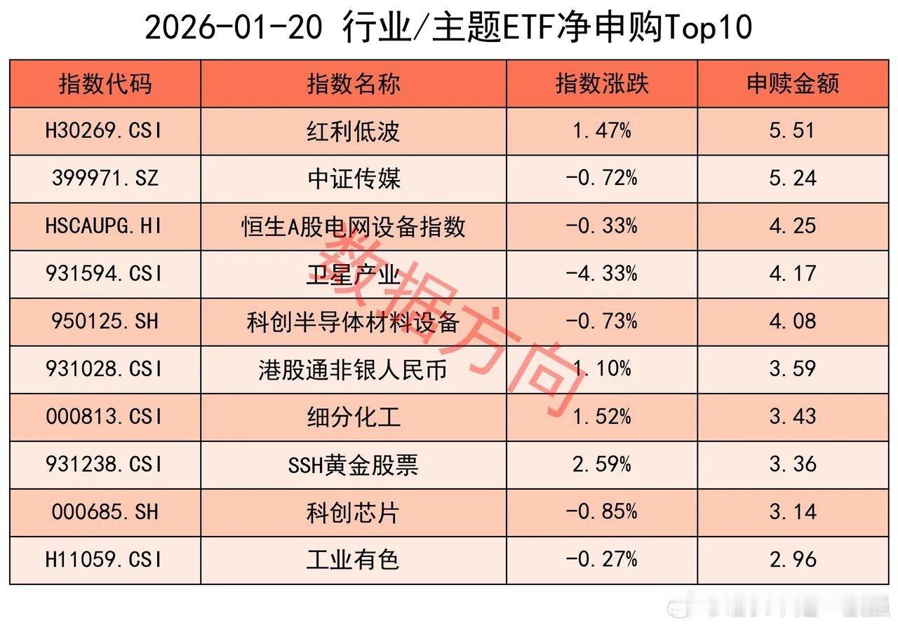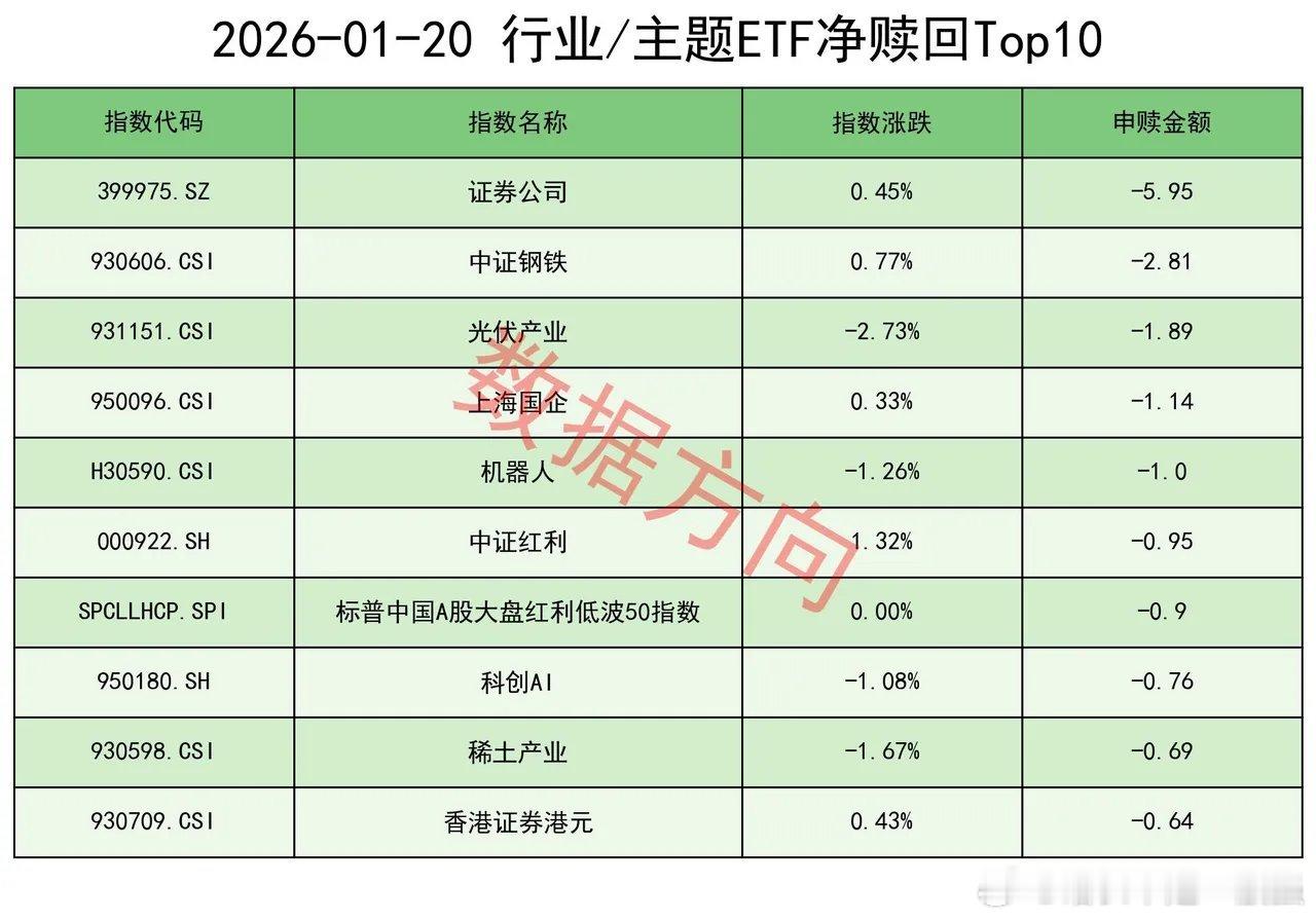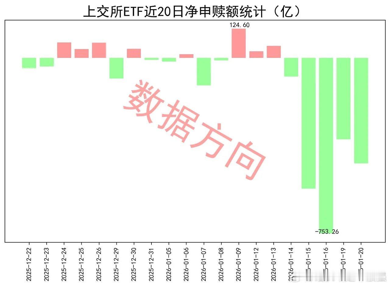 一觉醒来,美股全线狂跌隔夜外盘,美股全线狂跌。道指跌掉870点或1.76%,纳指跌掉561点或2.39%,标普500指数跌掉143点或2.06%。仅有国防军工、金属铜等少数板块逆市上涨。消息上,美国总统再次加强威胁以夺取格陵兰,并扬言向反对国家加征新关税,包括8个北约成员国,引发了市场的巨震。被称为“恐慌指数”的芝加哥期权交易所波动率指数(VIX)升至20。我A难免不受其影响。大操盘手已经提前采取了行动。不仅在期指上持有巨额净空单,而且在ETF上采取了大幅净赎回的操作。这使得他们在面对即将到来的巨震时能够更加从容一些。1月20日星期二,A股以震荡整理为主,上证指数跌幅0.01%,上交所ETF合计净赎回452.32亿元。这是连续第4天大幅净赎回。前面三个交易日分别为560.72亿、753.26亿、349.37亿,四天累计2115.67亿。这是一个非常惊人的数据。要知道,在此之前的时候,上交所股票型ETF单日净赎回的最高纪录为381亿,现在的4个交易日里,有3天都超过了之前的纪录!宽指仅有科创创业50指数(0.78亿)获小幅净申购,几乎可以忽略不计。沪深300指数(-245.52亿),大幅净赎回超过240亿。中证500指数(-91.79亿)、上证50指数(-58.33亿)、科创50指数(-49.7亿)、中证1000指数(-42.5亿)、中证A500指数(-16.29亿),净赎回亦不少。科创100指数(-0.41亿)、中证A50指数(-0.26亿)、上证指数(-0.2亿),分别被小幅净赎回。历史上,当所有宽指全部被净赎回时,通常是不好的短期信号。行业和主题 资金存在打架的情况。一边是红利低波指数(5.51亿)进入申购榜;一边是上海国企指数(-1.14亿)、中证红利指数(-0.95亿)、标普中国A股大盘红利低波50指数(-0.9亿)一起进入赎回榜。一边是港股通非银人民币指数(3.59亿)进入申购榜;一边是证券公司指数(-5.95亿)、香港证券港元指数(-0.64亿)进入赎回榜。一边是中证传媒指数(5.24亿);一边是科创AI指数(-0.76亿)进入赎回榜。一边是细分化工指数(3.43亿)、SSH黄金股票指数(3.36亿)、工业有色指数(2.96亿)等指数一起进入申购榜;另一边是中证钢铁指数(-2.81亿)、稀土产业指数(-0.69亿)一起进入赎回榜。其他进入申购榜的还有:恒生A股电网设备指数(4.25亿)、卫星产业指数(4.17亿)、科创半导体材料设备指数(4.08亿)、科创芯片指数(3.14亿)。其他进入赎回榜的还有:光伏产业指数(-1.89亿)、机器人指数(-1.0亿)。ETF
