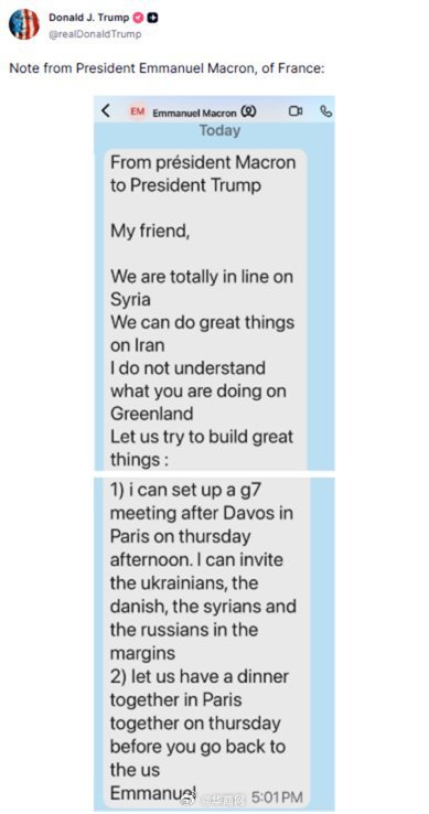 【#特朗普公开马克龙给他的私信#】据路透社20日报道,美国总统特朗普威胁称,将对法国葡萄酒和香槟征收高达200%的关税。路透社称,这显然是为了向法国总统马克龙施压,促使其同意加入特朗普宣布成立的“和平委员会”。接近马克龙的一位消息人士说,马克龙打算拒绝美方的邀请。20,日在被记者问及此事时,特朗普说道:“他这么说了吗?好吧,没人想要他,因为他很快就要下台了。”特朗普继续说道:“我会对他(法国)的葡萄酒和香槟征收200%的关税,他就会加入,但他不必非得加入。”特朗普还公开了一条马克龙发给他的私人聊天信息。根据特朗普在社交平台“真实社交”上公布的截图,马克龙称他“不理解特朗普在格陵兰岛问题上的做法”。路透社称,目前欧盟国家出口到美国的葡萄酒和烈酒面临15%的关税,法国一直在积极游说美方将其降至零。美国是法国葡萄酒和烈酒的最大海外市场,2024年出口额达38亿欧元。马克龙的一名助手表示,爱丽舍宫已注意到特朗普的相关言论,并强调,以关税威胁来影响第三方外交政策是不可接受的。根据截图,马克龙在聊天中还提议主办一场七国集团(G7)领导人会议,并邀请俄罗斯等国与会。他表示,可以邀请乌克兰、丹麦、叙利亚和俄罗斯的代表参加1月22日G7会议的场外活动,并邀请特朗普在巴黎与他共进晚餐。马克龙称特朗普为“我的朋友”,并表示在叙利亚问题上他与特朗普“完全一致”,双方还可以在伊朗问题上“做一些伟大的事情”。报道称,一名接近马克龙的消息人士向路透社证实,特朗普公布的截图属实。