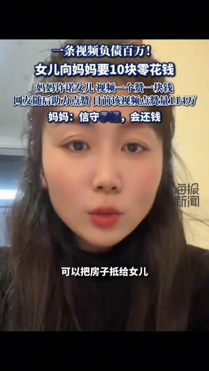 一条视频负债百万!女儿向妈妈要10块零花钱,妈妈许诺女儿视频一个赞一块钱。 河南郑州。 妈妈:信守承诺,会还钱。 100多万,应该有能力能还上。 先挣钱呗。 如果挣钱能还上了。 行了,如果到最后迫不得已的情况下可以把房子抵给女儿。 之前点赞量就很少,都是个位数,很少那种。