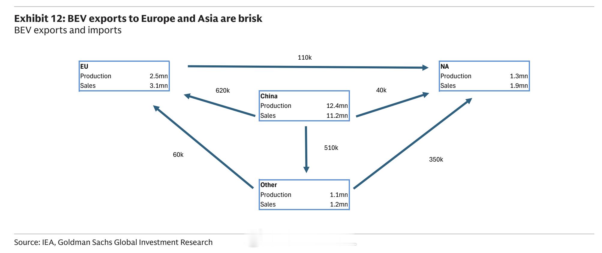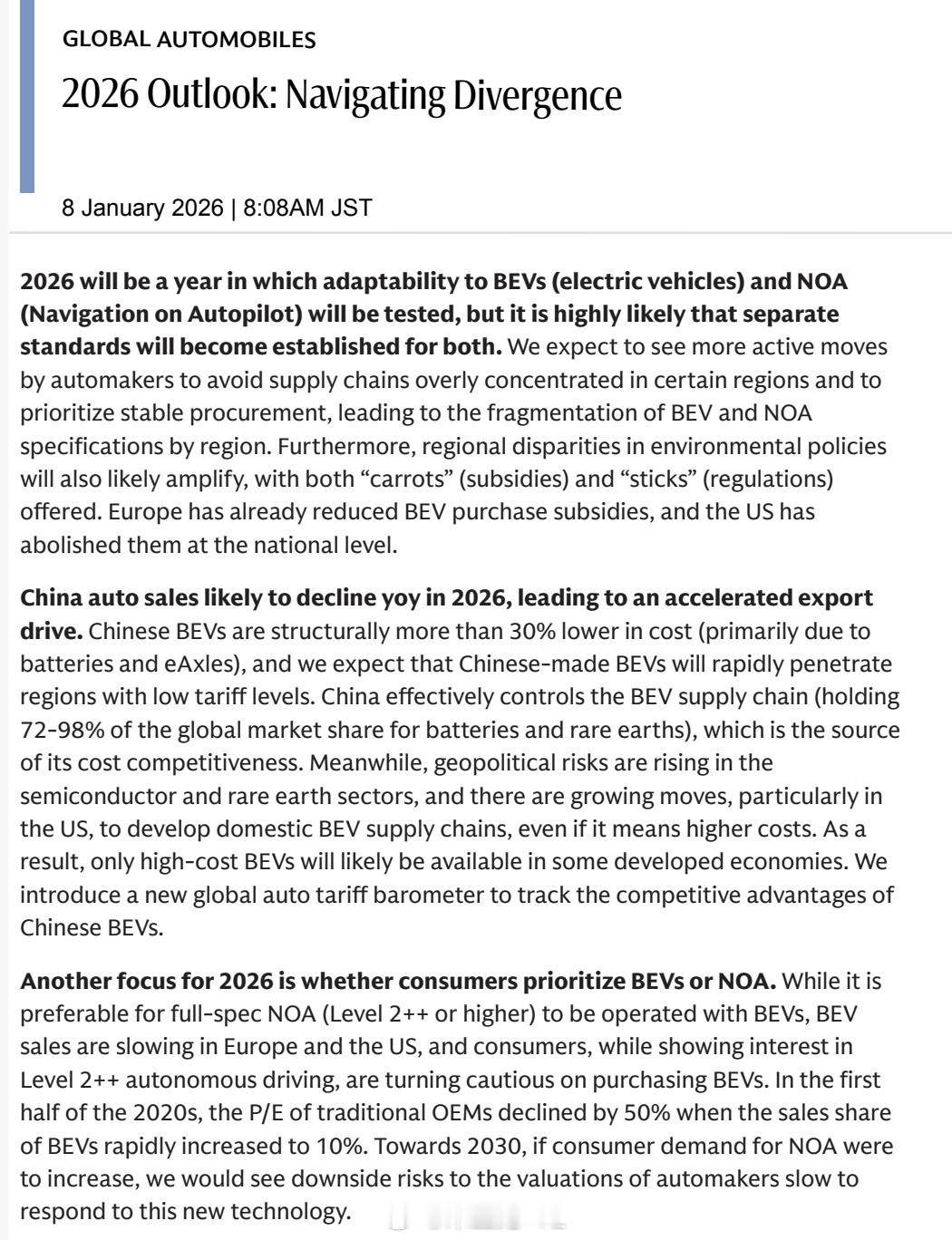 高盛最近的报告:在中国市场,2026 年汽车销量可能会出现同比下滑,这反而会加速出口导向,高盛预测中国的出口的天花板在1000万台。中国纯电动车在成本结构上普遍比海外低 30% 以上,核心优势来自电池和电驱动系统。再加上中国在电池材料和稀土资源上的全球主导地位——市占率高达 70% 到接近 100%,这让中国车在价格上具备长期优势。真正值得关注的问题是:消费者未来更看重纯电动,还是更看重智能驾驶?从技术上看,全功能 NOA 更适合和纯电平台深度结合。但现实是,欧美纯电车的销量增速正在放缓。消费者对 L2++ 级辅助驾驶很感兴趣,却对是否要买纯电车仍然犹豫。回顾 2020 年代前半段,当纯电车市占率快速提升到 10% 左右时,传统车企的估值反而下跌了 50%。资本市场担心的是:技术转型带来的成本、风险和不确定性。如果到 2030 年,消费者对 NOA 的需求明显上升,那些没有及时跟进智能驾驶的车企,估值可能会继续承压(生存压力变大)。2026 年,对很多车企来说,是战略取舍之年。新能源汽车大v聊车