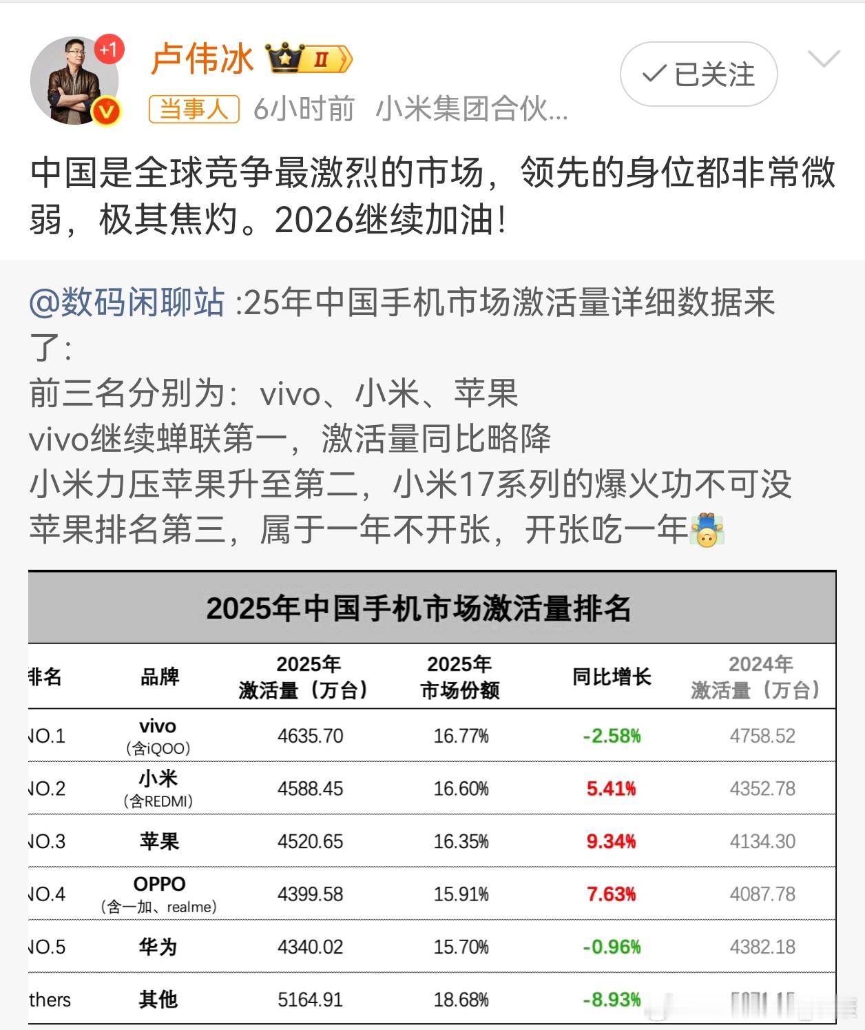 2025年中国手机激活量前三:vivo第一(微降),小米第二(靠小米17爆卖反超