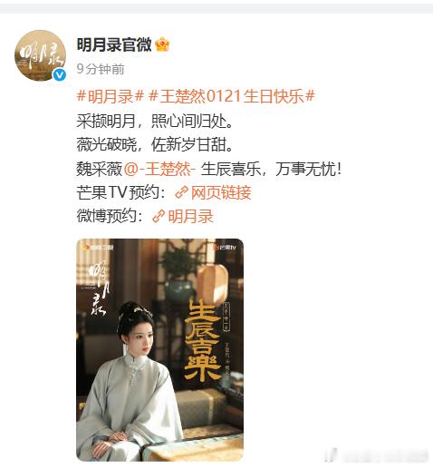 明月录给王楚然庆生明月录祝王楚然生日快乐 权谋江湖藏深情,生辰喜乐伴君行。《明月录》致谢王楚然的精彩演绎,祝她生辰快乐,未来繁花相送一路生花。