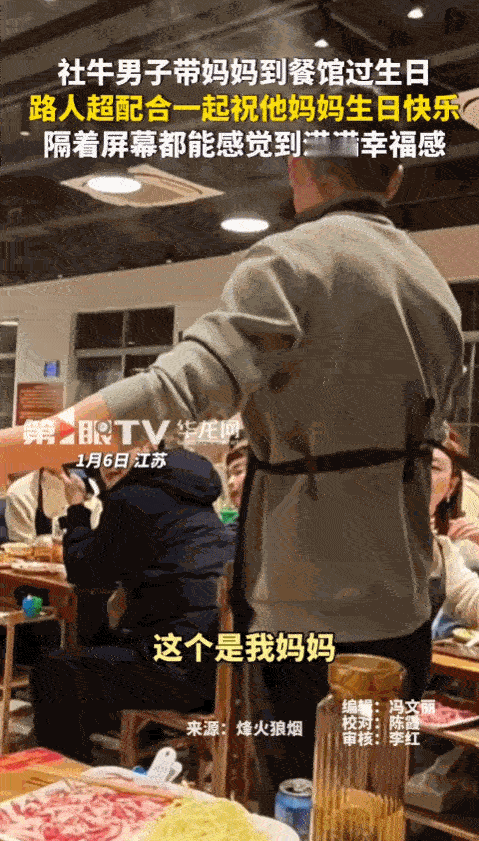 破防了!近日,江苏一男子带妈妈到餐馆过生日,突然,男子站起身对着餐馆里所有吃饭的客人,说希望大家配合他对妈妈说一声生日快乐,没想到,大家鼓掌表示同意!于是男子高喊:“妈妈”,众人齐喊“生日快乐!”妈妈流下了幸福的泪水。 1月6号,江苏一家餐馆里,一个小伙子带着妈妈来过生日,他想给妈妈一个不一样的惊喜也正是这个小小的想法,酿成了全网都在夸的温暖瞬间。 说真的,换做是我,真的没勇气做这件事,你们想想,在满是陌生人的餐馆里,大家都在安安静静吃饭,各自忙各自的,谁也不认识谁。 可这个小伙子,趁着和妈妈吃饭的间隙,悄悄站起身,整理了一下衣服,就转身对着餐馆里所有吃饭的人开口了。 他没有扭扭捏捏,语气特别真诚,还带着点小期待,说今天是他妈妈的生日,希望大家能配合他一下,一起给妈妈说一句生日快乐,让妈妈能有个难忘的回忆。 说实话,听到这里我都觉得,这请求有点冒昧,毕竟大家素不相识,凭什么要配合你做这种“私事”?说不定还有人会觉得麻烦,直接拒绝。 可万万没想到,小伙子的话音刚落,餐馆里就响起了齐刷刷的掌声,没有一个人拒绝,也没有一个人面露不耐烦。 本来低头吃饭的食客,全都放下了碗筷,眼神里满是善意,默默陪着这个小伙子,准备一起完成这个小小的惊喜,那一刻,原本普通的餐馆,瞬间变得特别温暖。 小伙子看到大家都愿意配合,眼里满是感激,他转过身,看着身边的妈妈,用尽全身力气,喊了一声“妈妈”。 紧接着,餐馆里所有的陌生人,像是提前约定好一样,齐声喊出了“生日快乐”,声音洪亮又真诚,没有一点敷衍。 阿姨当时就愣了一下,紧接着眼眶就红了,眼泪顺着脸颊慢慢流了下来,这眼泪,绝对不是难过,是实打实的幸福,是被儿子的孝心打动,更是被一群陌生人的善意温暖到了。 她一边悄悄擦眼泪,一边忍不住笑,那种发自内心的喜悦,隔着屏幕都能感受到。 现在我们的生活节奏越来越快,走在大街上,大家都是行色匆匆,邻里之间互不相识,陌生人之间更是恨不得隔着三尺远,“事不关己高高挂起”,好像成了很多人的处世准则。 我们总说人心冷漠,可这场小小的生日祝福,却狠狠打了“冷漠”一巴掌。 其实哪有那么多冷漠的人,大多数人,心里都藏着一份善意,只是很多时候,我们都太拘谨,太在意“多一事不如少一事”,所以不敢轻易表达。 这个小伙子,敢勇敢地表达对妈妈的爱,敢向陌生人发出请求,这份勇气,值得我们所有人学习。 而那些配合他的食客,没有丝毫犹豫,用一句简单的祝福,温暖了两个人的一天,这份善意,更让人动容。 如果是你,在餐馆里遇到这样的请求,你会愿意配合吗? 信息来源:华龙网