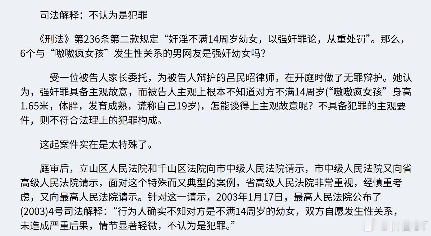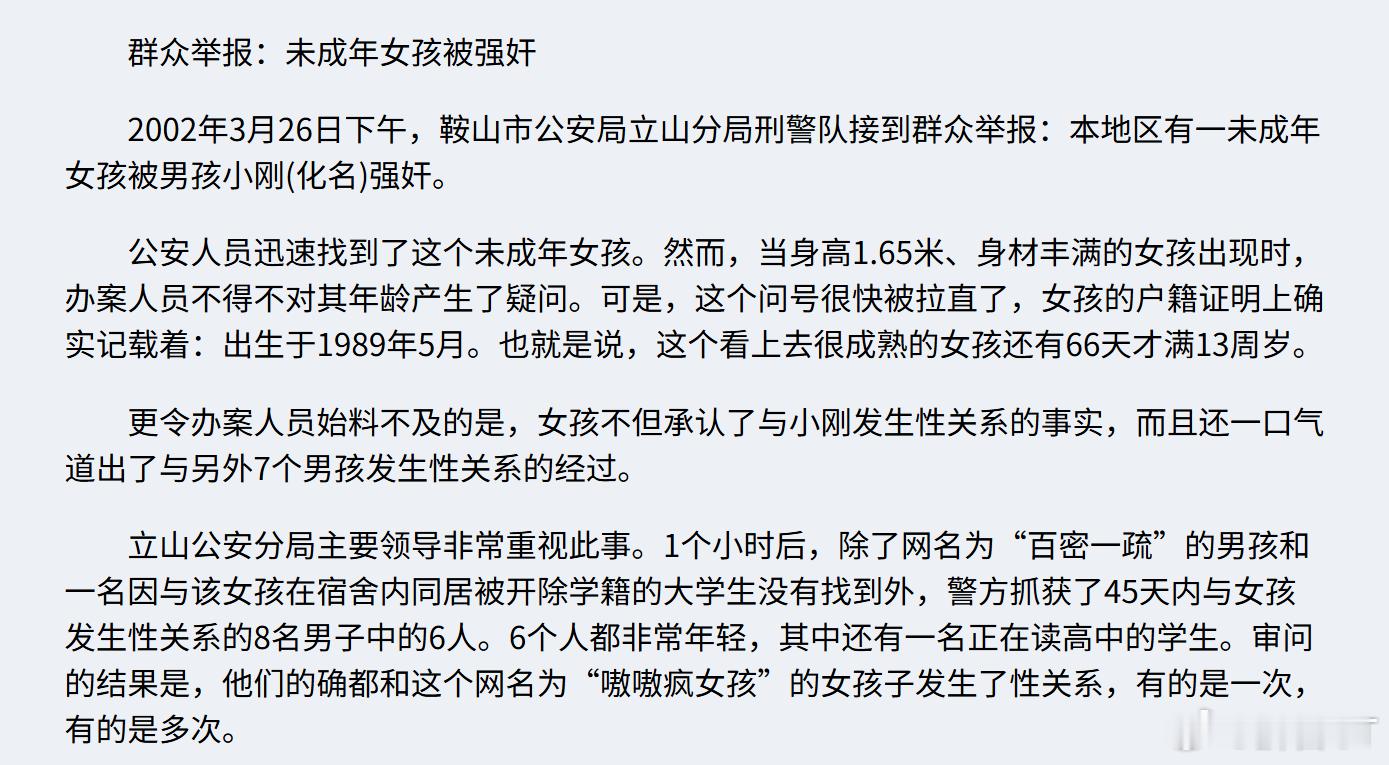 3人性侵12岁女孩警方不予立案看到在这个话题下,提到了“嗷嗷疯女孩”案。由于我正好收集过相关资料,可以给大家详细的讲一下。这案子发生的具体时间相当久远,已经是20多年的2002年。当年的3月26日下午,鞍山公安立山分局接到群众举报:当地有一个未成年女孩被男孩小刚(化名)强奸。得知有未成年少女被强奸,警方迅速出动,很快就找到了当事女孩。但民警在找到后的第一时间,却对其年龄产生了疑问。原来,当事女孩不仅身高足足有1.65米,体态更是相当丰满。更让民警始料不及的是,女孩不仅承认了其与小刚发生过关系,还一口气说出了她与另外7个人发生关系的经过。同时表示,举报这件事情的人纯属多管闲事,“这都是我自愿的”。大约1小时后,警方抓获了45天内和她发生过关系的6个人。2个漏网之鱼,分别是一个网名为“百密一疏”的男性,以及另外一个和她在宿舍同居后被开除学籍的大学生。报道称,被抓的6个人都非常年轻,其中还有一个正在读高中的学生。警方的审问结果是,6个人的确都跟女孩发生了关系,有的是1次,有的是多次。这案子,后来以“强奸幼女罪”移交起诉,但辽宁这边的法院硬是没敢接茬。从立山区法院和千山区法院,再到鞍山市中院,再到辽宁省高院,最后一路请示到最高院,才得出最终定论:1️⃣行为人明知是不满14周岁的幼女而与其发生性关系,不论幼女是否自愿,均应依照刑法第236条第二款的规定,以强奸罪处罚。2️⃣行为人确实不知对方是不满14周岁的幼女,双方自愿发生性关系,未造成严重后果,情节显著轻微,不认为是犯罪。这个解释,就是大名鼎鼎的法释[2003]4号解释。虽然在2013年,最高院以“与刑法规定相冲突”为由,将该解释废除,但随后出台的相关意见,均部分保留了该解释的相关内容。比如,在2013年和2023年发布的《关于依法惩治性侵害未成年人犯罪的意见》和《关于办理性侵害未成年人刑事案件的意见》中,均明确规定,对已满12周岁但不满14周岁的被害人,从其身体发育状况、言谈举止、衣着特征、生活作息规律等观察可能是幼女,而实施奸淫等性侵害行为的,应当认定行为人“明知”对方是幼女。关于这点,同样出名的“杜素媛”案就是最好的例证。据了解,这个案子的基本案情是,2022年8月,一14岁女孩被家长发现已经怀孕7个多月,根据其供述,警方先后抓获了5个和她发生过关系的未成年人,并予以重判。但这5个人里,没一个是孩子的生父。警方最终查明,孩子的生父,其实是另外一个与他发生过关系的成年男性。而在当时,认定其无罪的依据,就是此前提及的相关意见。实务案例看一看