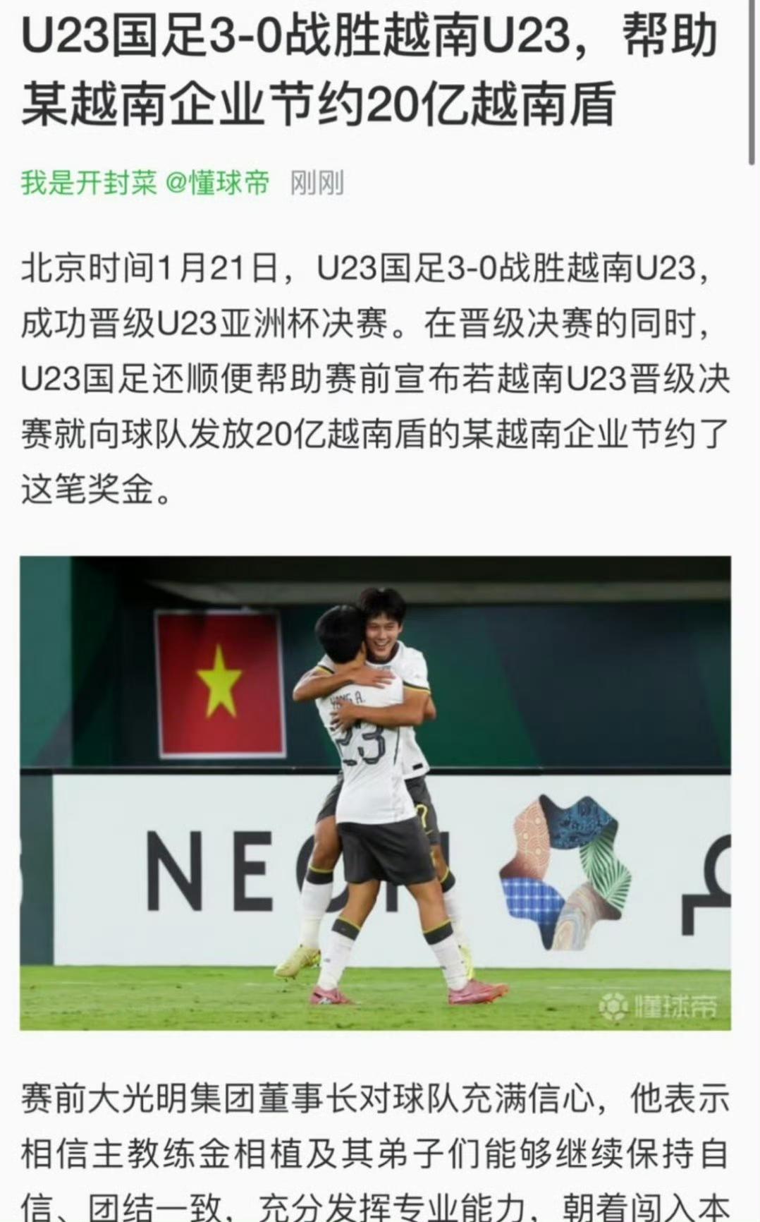哈哈哈哈好贱的新闻标题...《U23国足3-0战胜越南U23,帮助某越南企业节约20亿越南盾》: “北京时间1月21日,U23国足3-0战胜越南U23,成功晋级U23亚洲杯决赛。 在晋级决赛的同时,U23国足还顺便帮助赛前宣布若越南U23晋级决赛就向球队发放20亿越南盾的某越南企业节约了这笔奖金。”u23世界杯 u23队 中国u22男足