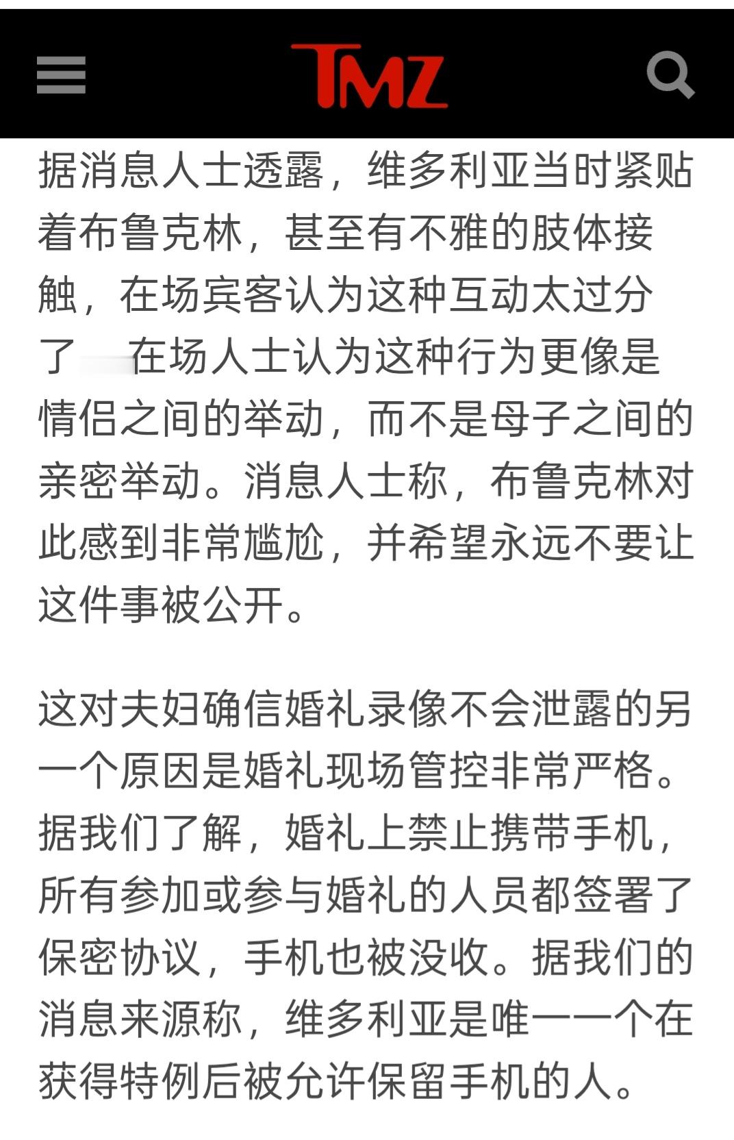 关于维多利亚在儿子婚礼上抢走新娘新郎的第一支舞,TMZ采访了当天在场的相关人士。报道说维多利亚确实抢舞了,而且贝嫂不合时宜的火辣动作令儿子尴尬,在场来宾也有些不知所措。不过来宾手机都被收走,这段视频不会泄露出来。补充:看了国外评论,许多欧美网友认为维多利亚的举动“disgraceful”(可耻),并强调第一支舞不应被母亲取代。这是“evil”(邪恶)“narcissistic”(自恋)的行为,尤其是因为它发生在500位嘉宾面前,抢了新娘的风头。有人说这破坏了婚礼的浪漫氛围,是对新娘的侮辱。 在一些西方国家婚礼上的“第一支舞”通常被视为新郎和新娘的专属浪漫时刻,象征着他们婚姻的开始。这是一个高度仪式化的传统,许多人会为此精心挑选歌曲和编排舞蹈。如果有人“抢走”这个时刻,特别是婆婆介入,会被视为对新人隐私和自主权的侵犯。