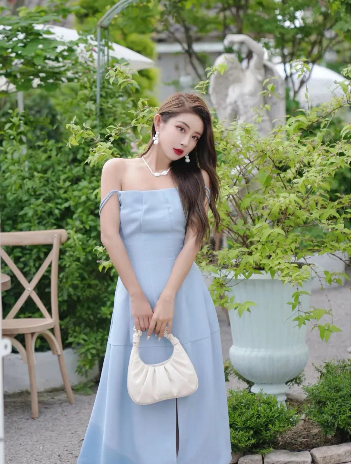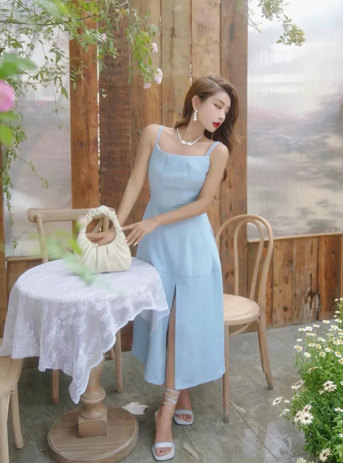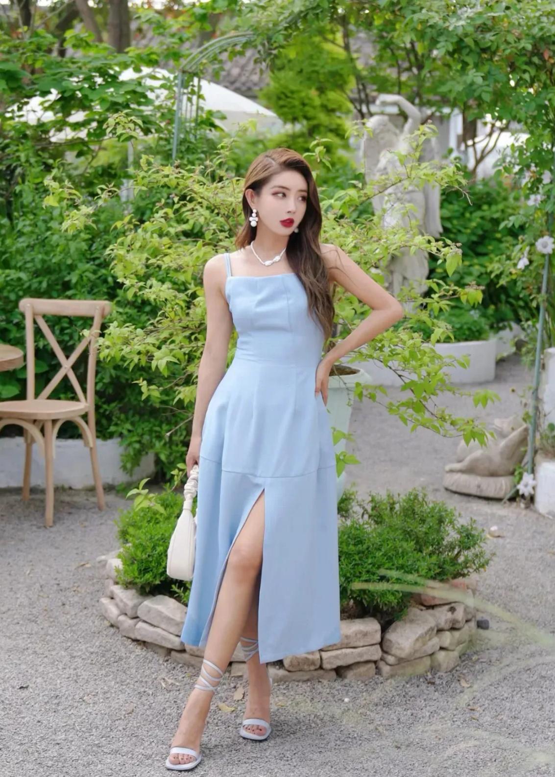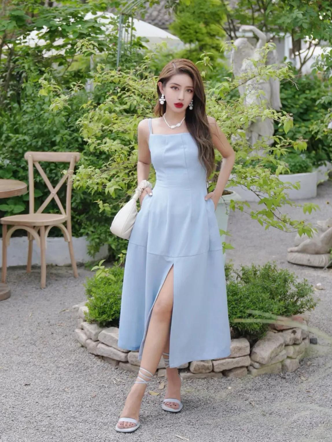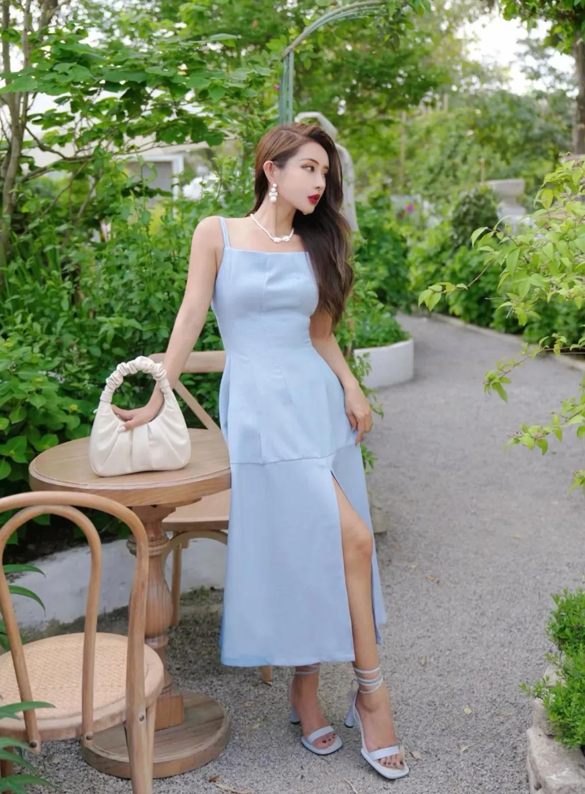 这套穿搭是优雅清冷的浅蓝轻熟风,把温柔色调与轻熟感细节融合。浅蓝吊带长裙自带清冷优雅感,开叉设计注轻熟感,修身版型显身材曲线。 搭配珍珠配饰强化优雅质感,白色手提包+绑带凉鞋呼应整体清新调性,让浅蓝造型更显精致。充分展现穿着者优雅清冷的轻熟魅力。浅蓝吊带裙 浅蓝穿搭美学 浅蓝长裙 每日搭配分享·时尚穿搭