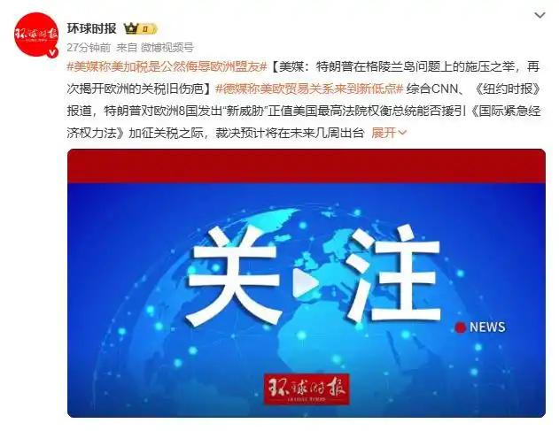 美媒称格陵兰关税粉碎欧盟绥靖计划,这事挺有意思。特朗普宣布对反对他收购格陵兰岛的欧洲国家加征关税,从10%数月后增至25%,这直接颠覆美欧贸易谈判进展。欧盟此前还想着通过军事演习等方式安抚特朗普,可这反倒触动了他。 冯德莱恩面对特朗普的威胁回应“软弱”,凸显出人们对她领导能力的不满。她倾向贸易让步,却没能阻止美国行动,也没给欧盟带来好处。西班牙前外交大臣称“欧洲的绥靖政策失败了”。经济疲软加上贸易态度软弱,格陵兰问题让美欧走向经济冲突,欧盟这绥靖计划算是泡汤咯。