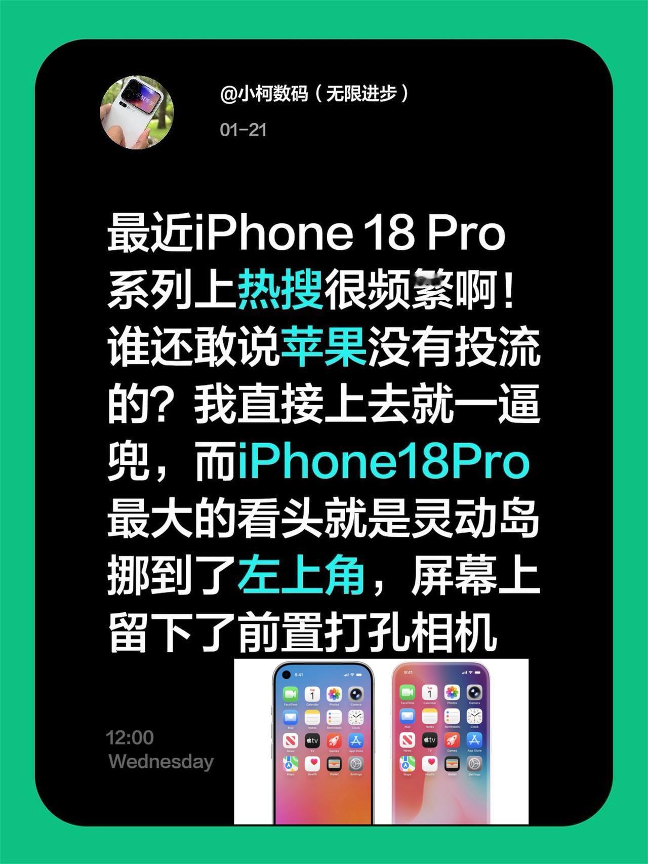 最近iPhone 18 Pro 系列上热搜很频繁啊!谁还敢说苹果没有投流的?我直接上去就一逼兜,而iPhone18Pro最大的看头就是灵动岛挪到了左上角,屏幕上留下了前置打孔相机