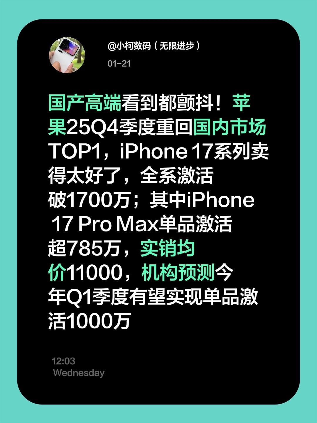 国产高端看到都颤抖!苹果25Q4季度重回国内市场TOP1,iPhone 17系列卖得太好了,全系激活破1700万;其中iPhone 17 Pro Max单品激活超785万,实销均价11000,机构预测今年Q1季度有望实现单品激活1000万