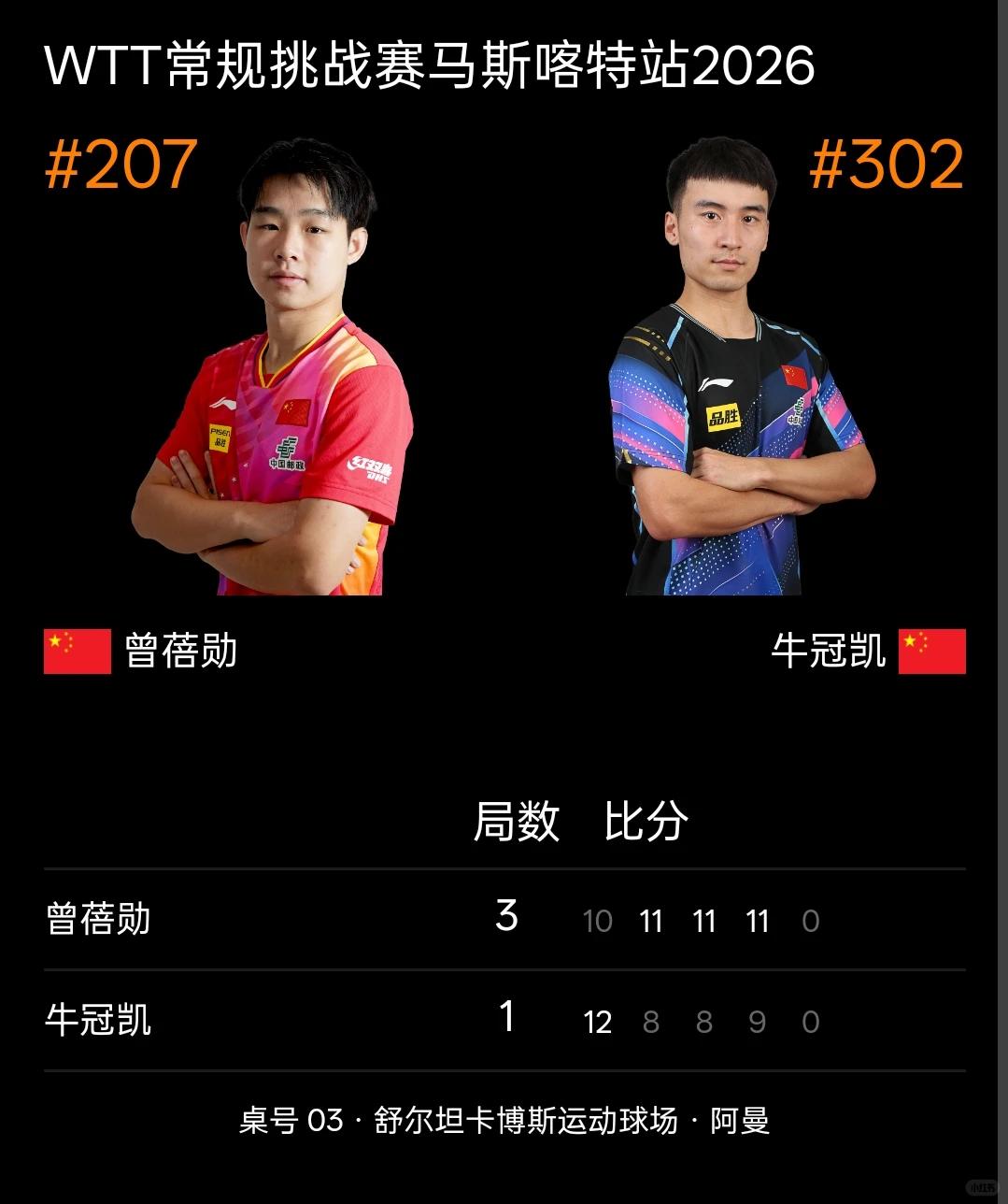 我勒个逗!小牛和小曾好不容易有个机会打比赛,结果资格赛就碰上,只能二进一! WTT常规挑战赛马斯喀特站小组循环赛 曾蓓勋2-3哈贝松 牛冠凯3-0哈贝松 曾蓓勋3-1马金宝 牛冠凯3-1马金宝 曾蓓勋3-1牛冠凯 小组循环赛,小背心(曾蓓勋)赢了小牛,出了线进了正赛! 结果,小背心进了正赛就遇到薛飞!又1-3输给了薛飞! 这次比赛,大家真是乱穿衣的节奏。 资格赛时,小牛穿的队服还是24年的队服,然后曾蓓勋和薛飞比赛时,还是穿的袁励岑的队服。 估计裁判都没有发现曾蓓勋穿的是袁励岑的衣服吧 燃哥这次比赛也是没谁了,自己输了3场,他的衣服输了4场。 大家就蛐蛐,小背心不穿这件衣服也许会赢。[捂脸] 这是比赛机会少,连最新版的队服都没有的吗? 虽然大家经常吐糟窝窝头不做人,但是连wtt都没有的话,这些打不上绝对主力的运动员,岂不是比赛的机会更少?能上大赛的运动员就那么几个头部的运动员,后面还有那么多没打出来的小将,老将,他们也需要机会参加比赛,历练吧。 所以说,凡事有利有弊,不能一概而论。