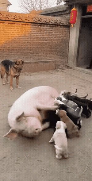 刚喂过崽的猪妈妈,躺在院子里,想要清净一会儿。结果,10来个小狗崽子就闻味儿而来,一窝蜂一样滴跑过来叼住猪妈妈的口粮袋。 这可把猪妈妈给烦坏了:我就想享受下片刻不用带娃、不用奶娃的休闲时光啊,我是招谁惹谁了?这写小狗崽子是要把我给掏空吗? 咱就说,猪妈妈对自己的崽子都是有点爱但是不多呢,对跨越种族的狗类幼崽还能有啥爱?再说你们妈妈还在旁边站着呢,你们祸害我干啥? 于是它“腾”一下,就站了起来,想把这些烦人的狗崽子甩出去。 可惜啊,它都如此烦躁了,还有几个死皮赖脸的狗崽子叼住不放呢。 这一幕,可把看热闹不怕事儿大的女主人给乐坏了。 而狗妈妈却拉拉个大长脸,心里很是不满,猪妈妈和狗崽子都是在磕碜谁呢?哎,都怪自己不争气,口粮袋空空,产量跟不上啊……