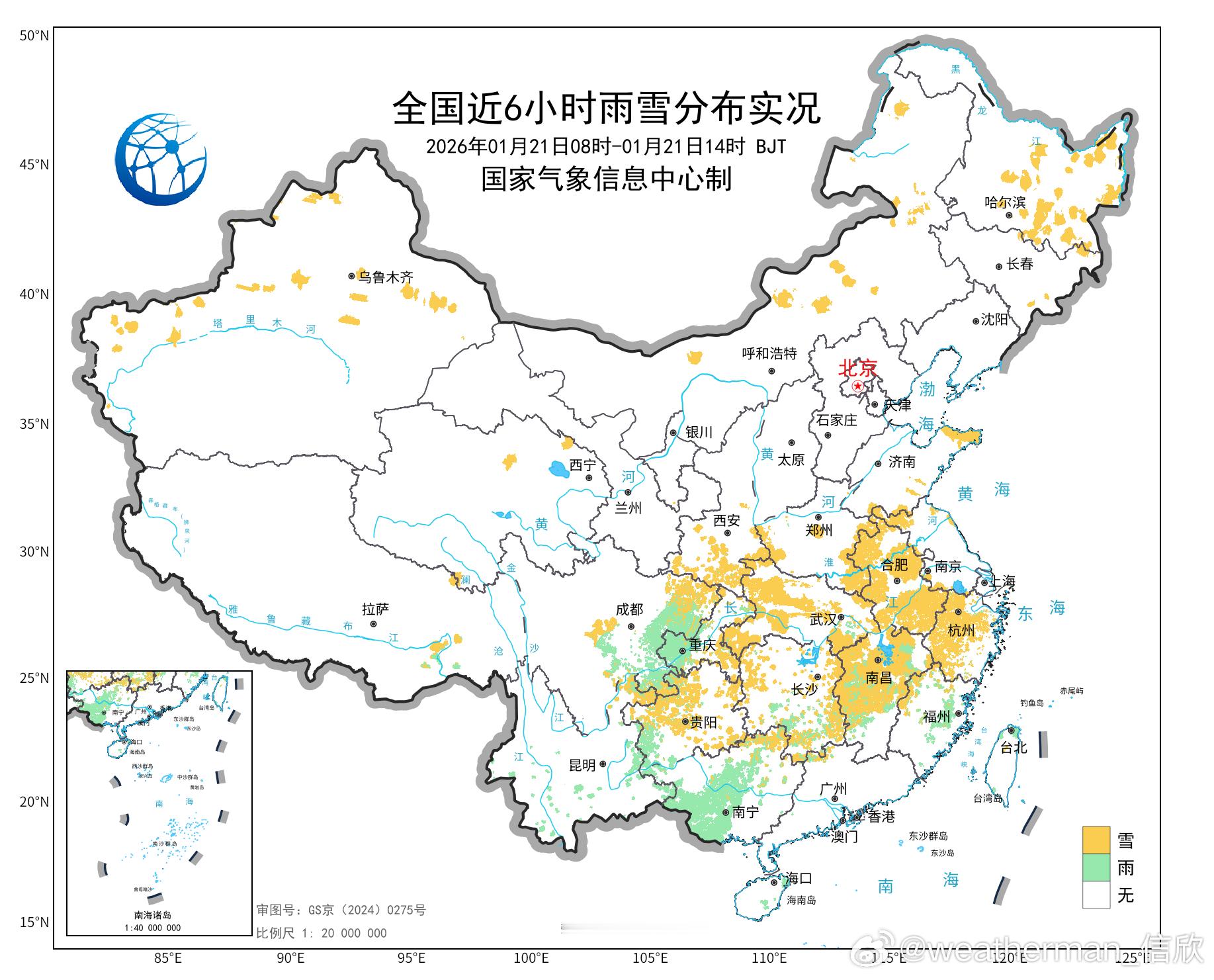 【雨雪】今天白天,山东半岛出现冷流降雪,在淮河以南多地,也出现了雨雪,总体强度不